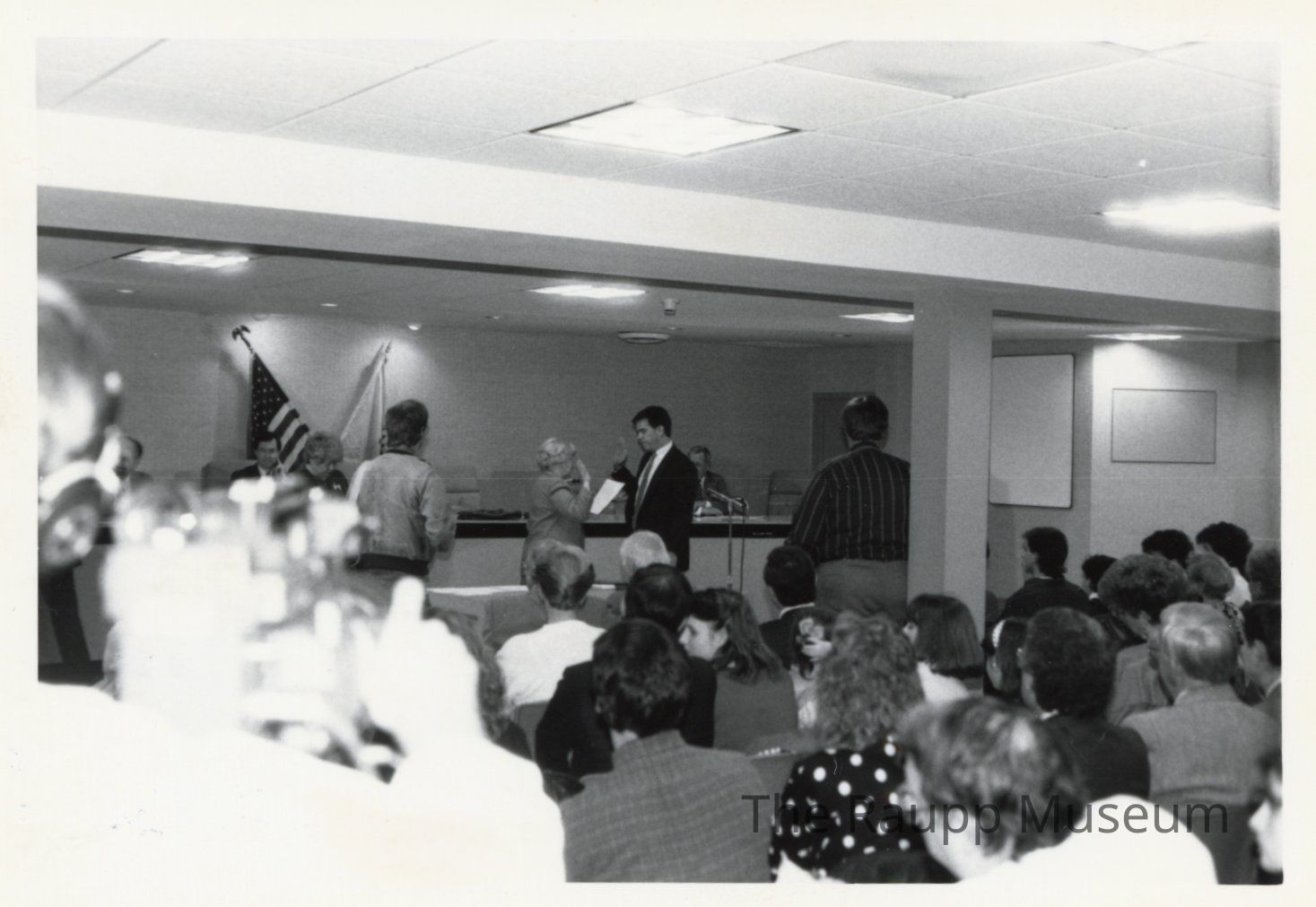 One (1) black and white photograph of Village President Verna Clayton swearing in new Board officials. There are people seated in the forefront watching and a man on the left filming the event.Made/Created