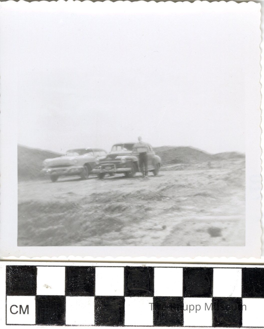 One (1) black and white square photograph of two cars in a dirt field and a man standing next to the cars in dark pants and a light colored shirt. There is a zigzag decorative edge, and white frame around the photo. Shows spaces where at the time the 1st homes were built in Buffalo Grove by Al Frank. Image is blurry.