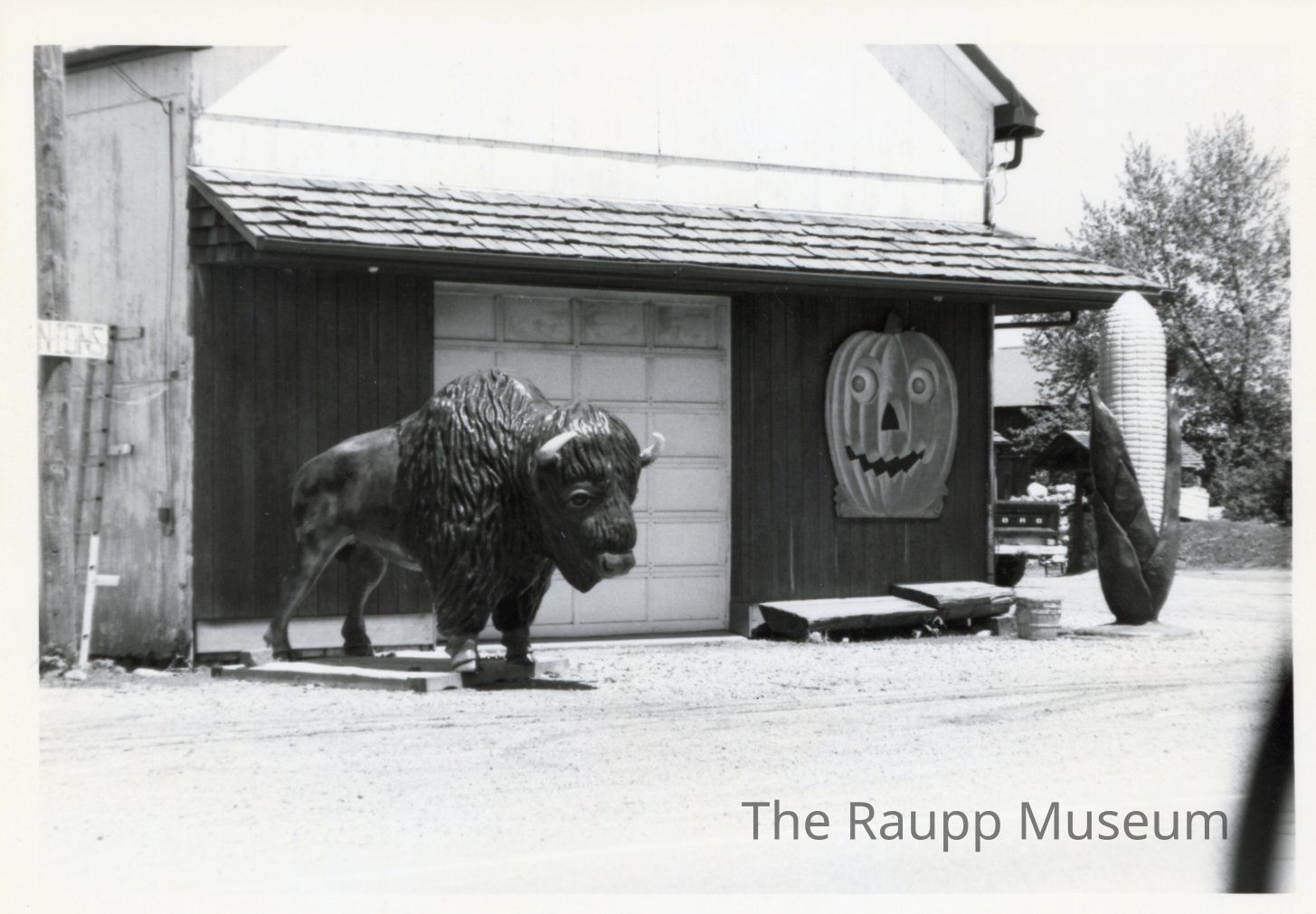 One (1) black and white photograph of a life sized Buffalo statue in front of a garage. The buffalo is on the left, with a sign for "onions" just visible in the left edge. There is a pumpkin poster on the garage, with a large corn statue on the right.Made/Created