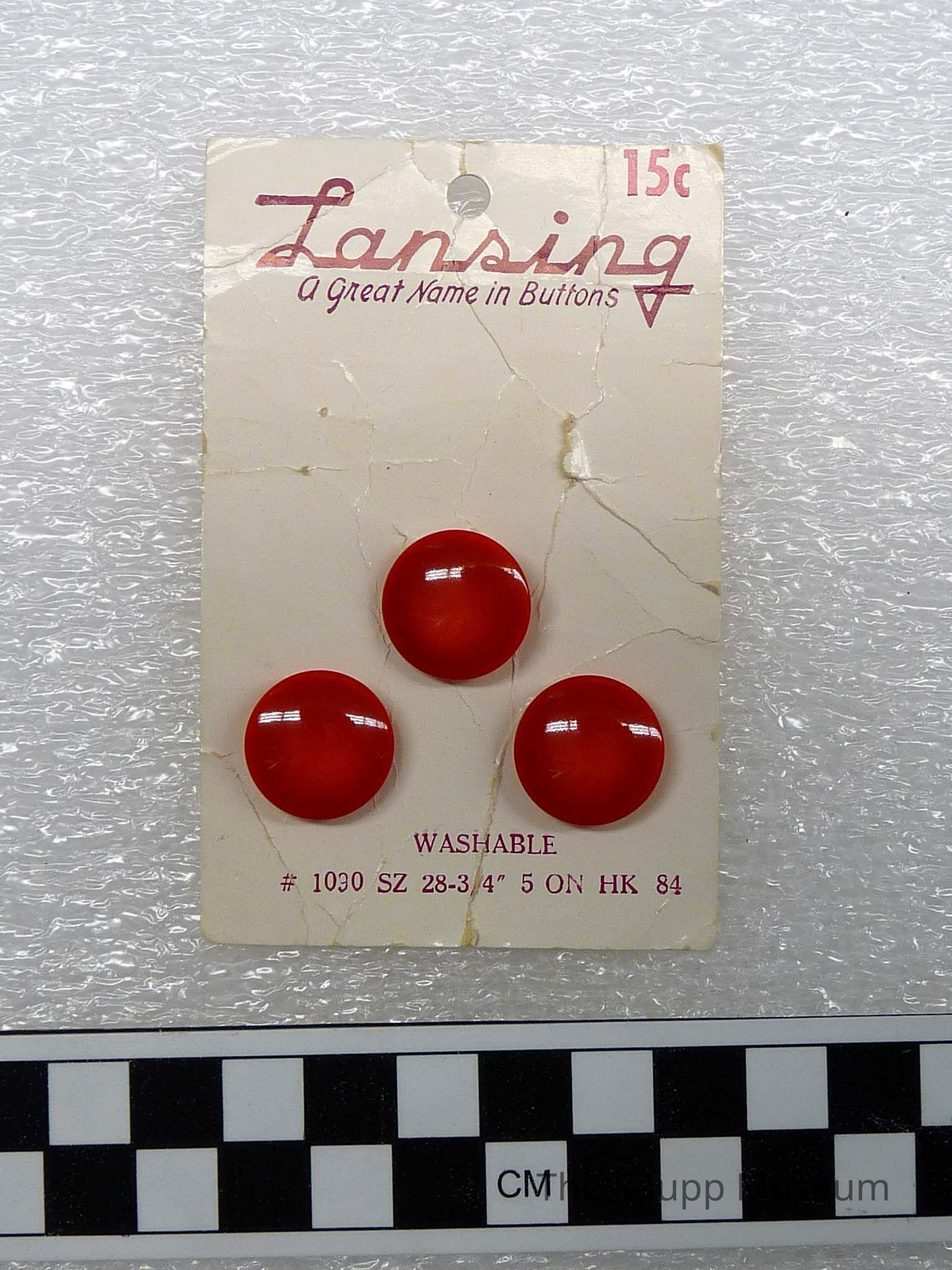 One (1) white paper card with 3 red plastic buttons attached. Card is designed to hold 5 buttons. Card is stamped with words "Washable #1030 SZ 28-3/4" 5 ON HK 84". Card has red lettering. Also marked with "Lansing - A Great Name in Buttons".Material