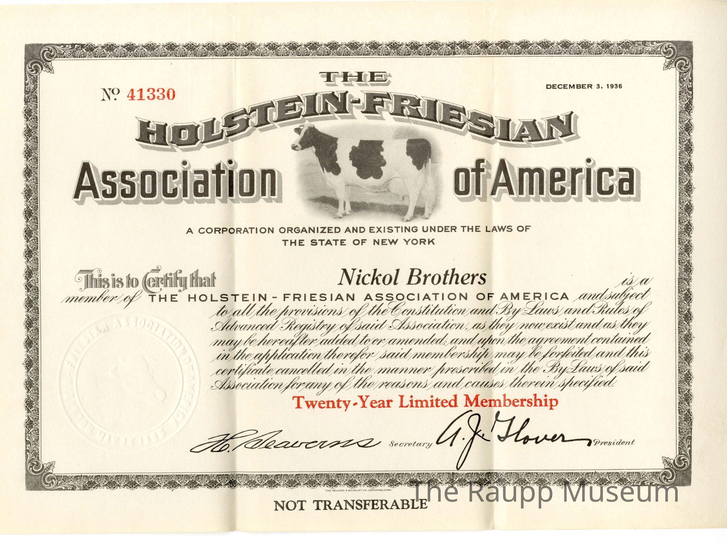 One (1) single-sided page for membership of the Nickol Brothers into the Holsetin-Fresian Association of America. Membership certificate has a decorative black border, with a cow picture in the center. There is an embossed seal stamp on the bottom left corner. Membership is a twenty-year limited membership from December 3, 1936.