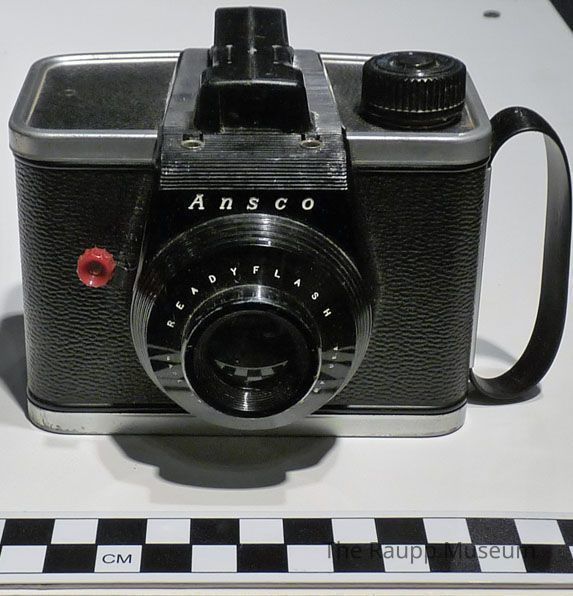 Camera has black textured case with silver trim, removable lid, and plastic fittings for the lens, shutter and viewfinder. With a fixed-focus lens, fixed aperture and single-speed shutter. Lens mount has two flash terminals. "Ansco Ready Flash" around the lens. Plastic carrying strap attached to one side.Dimensions