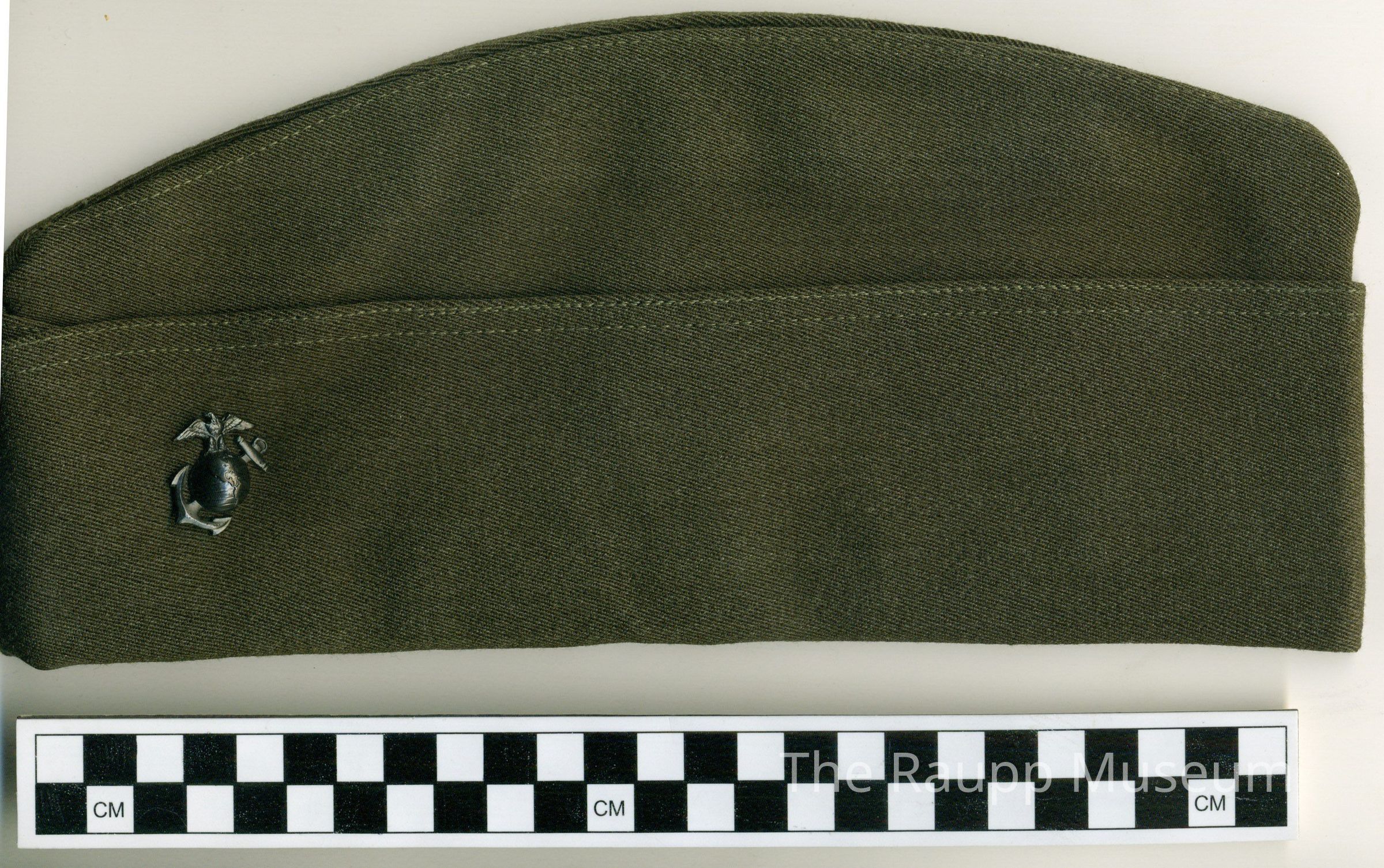 Flat green wool hat, military issue with metal insignia badge attached to lower left flap area on the front. Hat has a reinforced perforated area to attach the badge. Soft with a wide, heavy horizontal fold, and center crease. Interior is lined with brown satin, brown leather sweatband has black stamp text: "W J Kiddle" and fabric label with text: "100% All Wool; 7 1/4." Badge is metal with a screw backing. It is a Marine insignia of a globe, anchor and eagle. The reverse side of the eagle has a sharp barb to keep the badge in place on the hat.Material