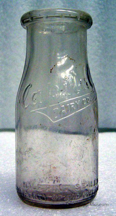 One (1) clear glass milk bottle, half-pint, wide rim around top, from Capital Dairy Company. Marked on bottle is: "Capital Dairy Co.", "Half Pint Sealed", "Property of and filled by Capital Dairy Co., Chicago". Stamped around the bottle is large "C" and "42" stamped on bottom.Dimensions