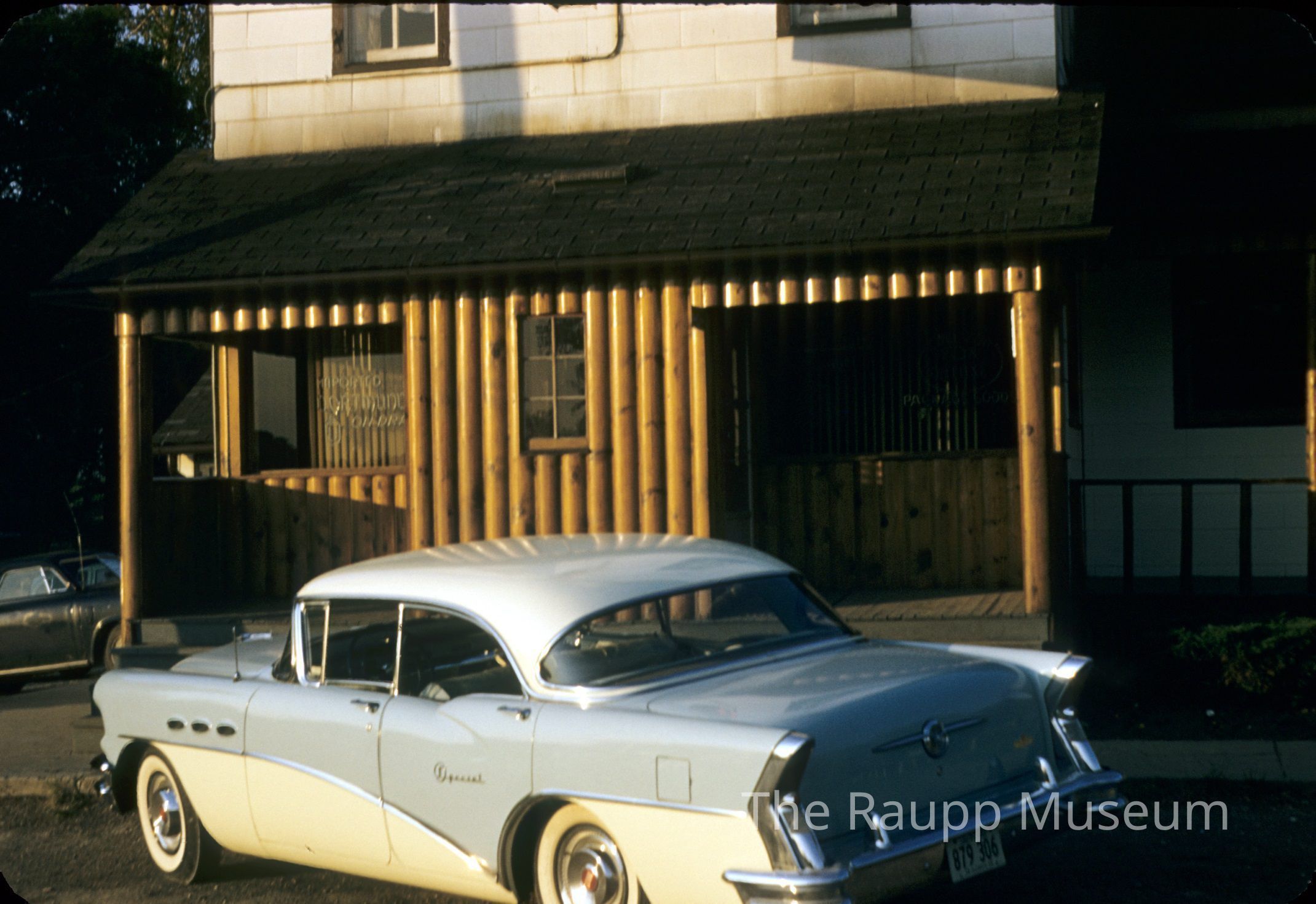 One (1) photographic copy of a blue and white sedan parked outside Bill's Buffalo House in the 1960s/early 1970s. Photo is taken showing the back and drivers side of the car, parked sideways in front of the front porch of the restaurant. In the back left side is another navy sedan parked. There is a log cabin design in the front and a black slate roof over it, and white cinderblock on the top and side. The front has two open areas on the side, and a window in the center. Car license plate is 879 306.Made/Created
