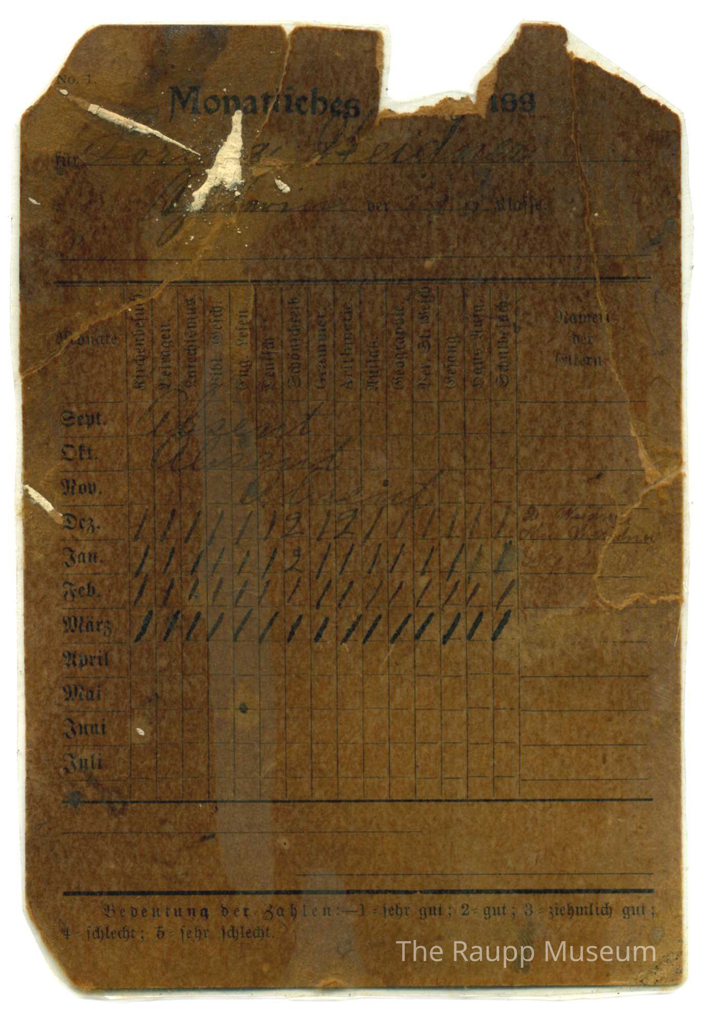 School report card Lorena Weidner from St. Mary School. Documents her performance from December 1910 - March 1911. Printed in German, shows school dues of 75 cents per month were paid , grades are listed in 15 categories for each of the four months covered. Report card uses scale of 1= very good, 2=good, ect to 5 = poor Card is marked in black in with all "1"s and three "2"s.
