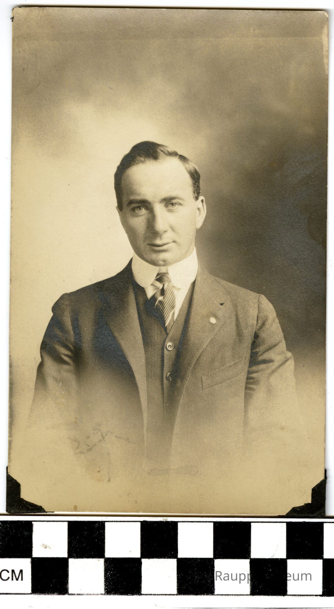One (1) sepia toned black and white image of Carl Christopher Raupp. Image is from the waist up. Carl is wearing a three piece suit, dark and stripped jacket and vest, with a white undershirt and striped black and white tie. There is a small circular pin on his left lapel. Hair is parted to the left. There is a pocket on the left side of the jacket. There are two black photo corners attached on the bottom corners.