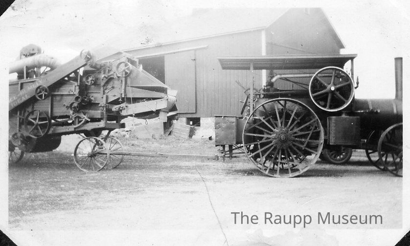 Black and white print with a white border. Image of a steam powered farm tractor. Has large black wheels and a wheel on the top right of it. Side view of the tractor connected by a wooden beam seen faintly in the image. Barn in the background with the door open. The back part of the tractor has a sign on it that says "ce-Humlly Meal." Front of image has three black photo corners on the edge. reverse side has black ink inscription: "Ronald Bradley steam power tractors, 1933 year, Carl Raupp Farm, Rt. 83 & Arlington."Dimensions