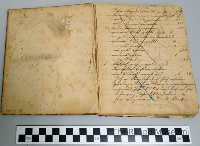 Hardcover ledger with brown marbled boards and leather spine. Blank lined pages with faded ink entries written in German. Earliest entry dated 1864. Used to keep financial records. Contains pencil notes and accounting figures on pastedowns.Relationships