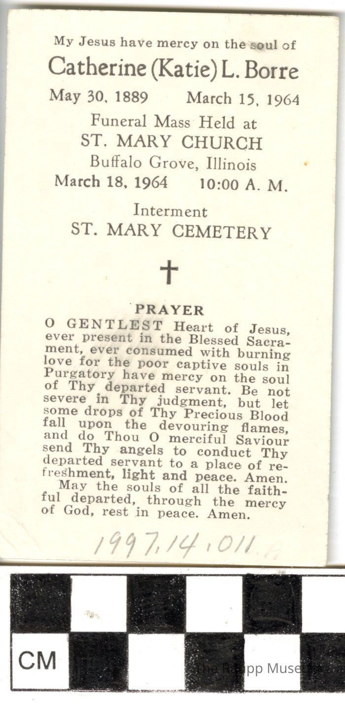 One (1) mourning prayer card for Catherine (Katie) L. Borre. On one side is a drawing of the Virgin Mary facing to the right, with a red shawl on and light green head shawl. There is a white halo around her head and blue background. On the back of the card is information about Catherine, including her birthdate, death, where her funeral is, and a prayer for her. The funeral was held on March 18th, 1964 at St. Mary Church.