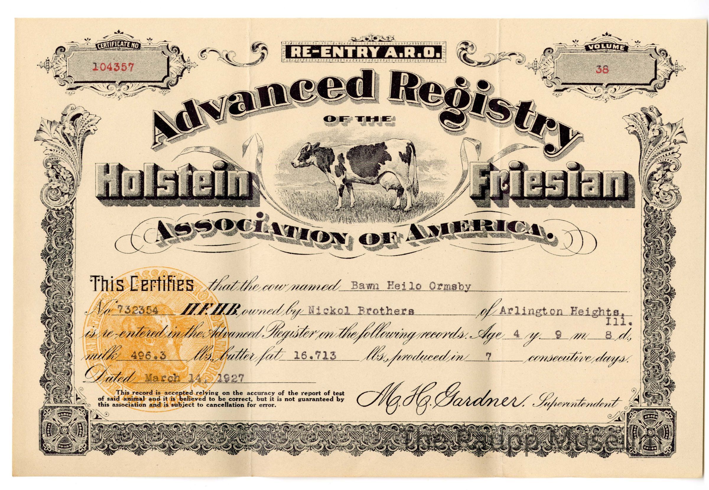 One (1) brown rectangular certificate for Advanced Registry of the Holstein Friesian Association of American. Certificate has decorative black border with a picture of a cow in the center. Certificate certifies that "Bawn Hailo Ornsby" (owned by Nickol Brothers) has been accepted into the advanced registry, for the amount of milk and butter fat produced in 7 consecutive days. Certificate is dated March 14, 1927.