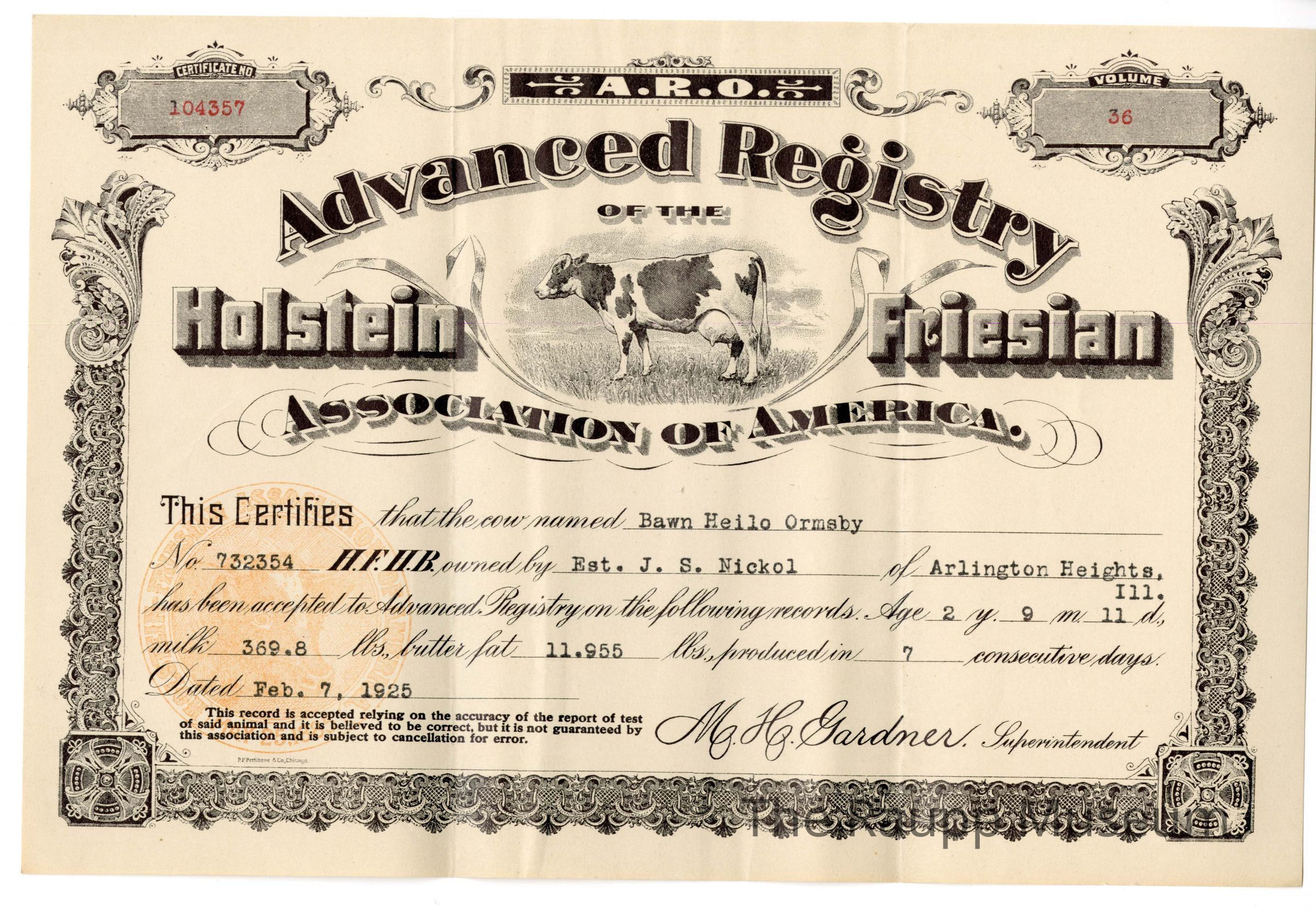 One (1) brown rectangular certificate for Advanced Registry of the Holstein Friesian Association of American. Certificate has decorative black border with a picture of a cow in the center. Certificate certifies that "Bawn Heilo Ornsby" (owned by John S. Nickol) has been accepted into the advanced registry, for the amount of milk (369.8 lbs) and butter fat (11.955) produced in 7 consecutive days. Certificate is dated February 7, 1925.