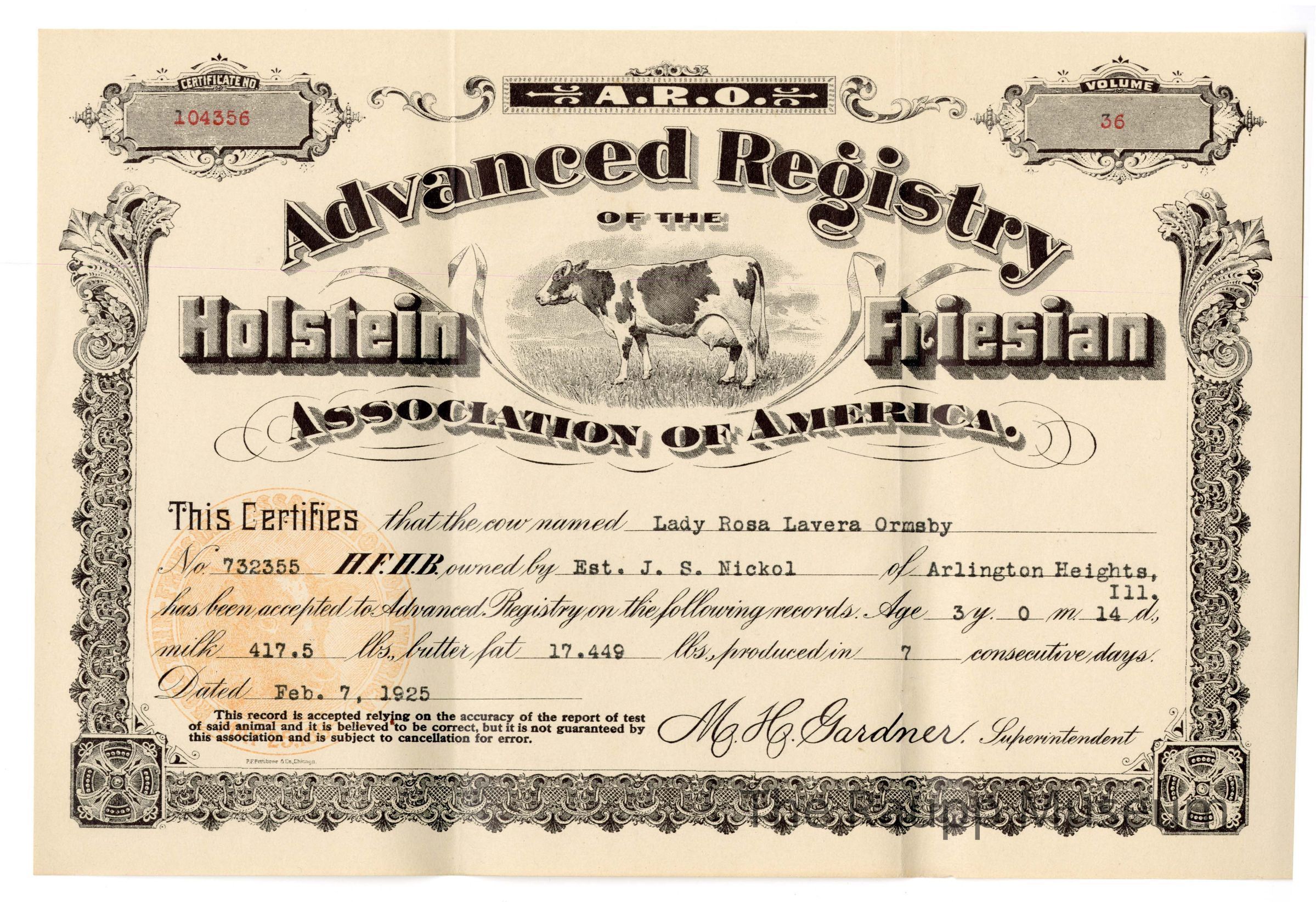 One (1) brown rectangular certificate for Advanced Registry of the Holstein Friesian Association of American. Certificate has decorative black border with a picture of a cow in the center. Certificate certifies that "Lady Rosa Lavera Ornsby" (owned by J.S. Nickol) has been accepted into the advanced registry, for the amount of milk and butter fat produced in 7 consecutive days. Certificate is dated February 7, 1925.