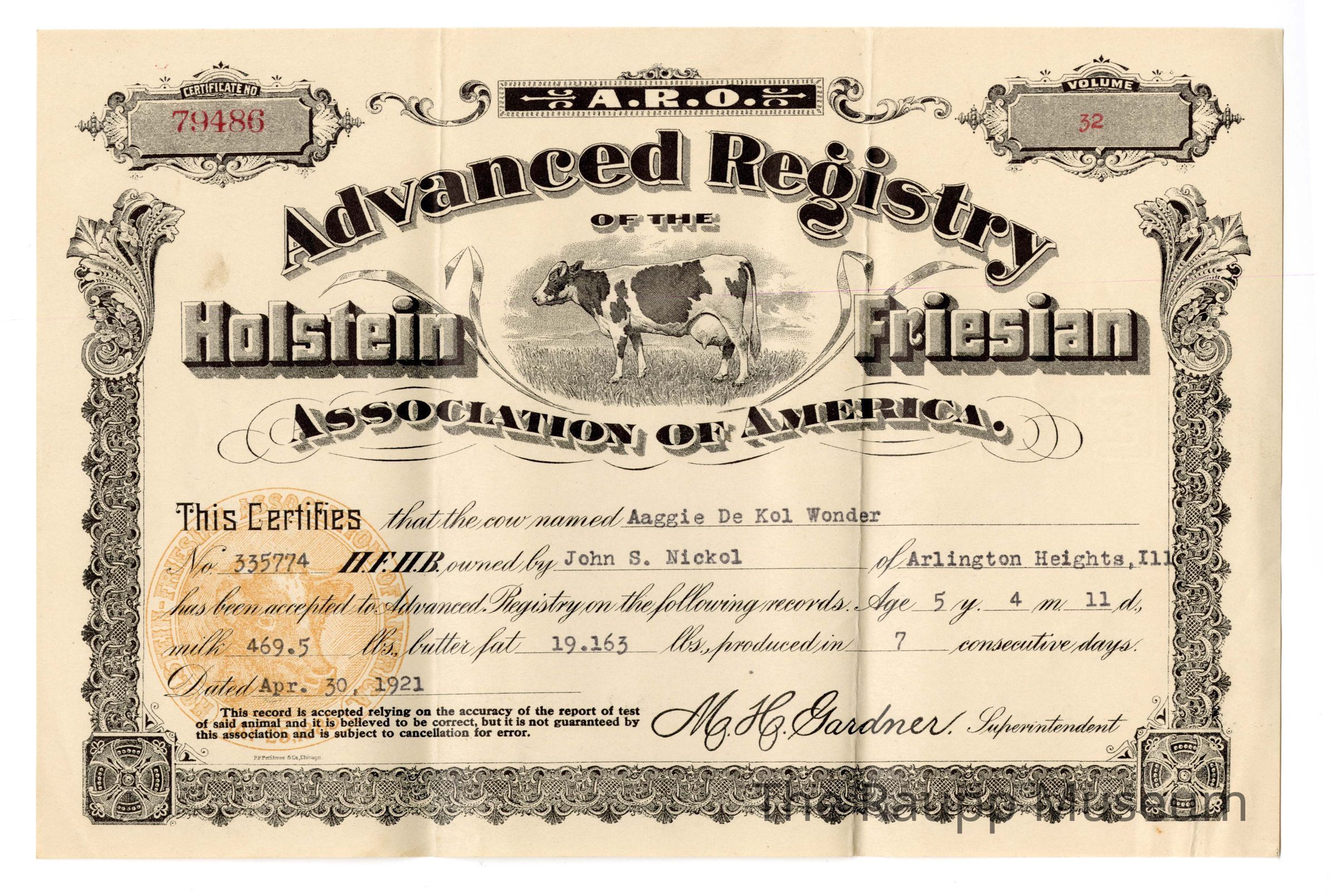 One (1) brown rectangular certificate for Advanced Registry of the Holstein Friesian Association of American. Certificate has decorative black border with a picture of a cow in the center. Certificate certifies that "Aaggie De Kol Wonder" (owned by John S. Nickol) has been accepted into the advanced registry, for the amount of milk (469.5 lbs) and butter fat (19.163) produced in 7 consecutive days. Certificate is dated April 30, 1921.