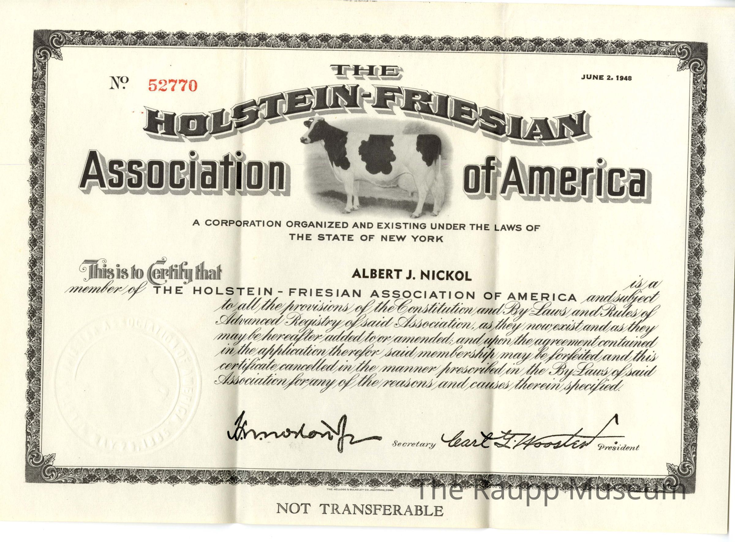 One (1) single-sided page certificate for "The Holstein-Friesian Association of America" that certifies the Albert J. Nickol is a member, dated June 2, 1948. Certificate has decorative black border and title, with a picture of a black and white cow in the center. There is an embossed seal on the bottom left corner. Certificate is No. 52770.