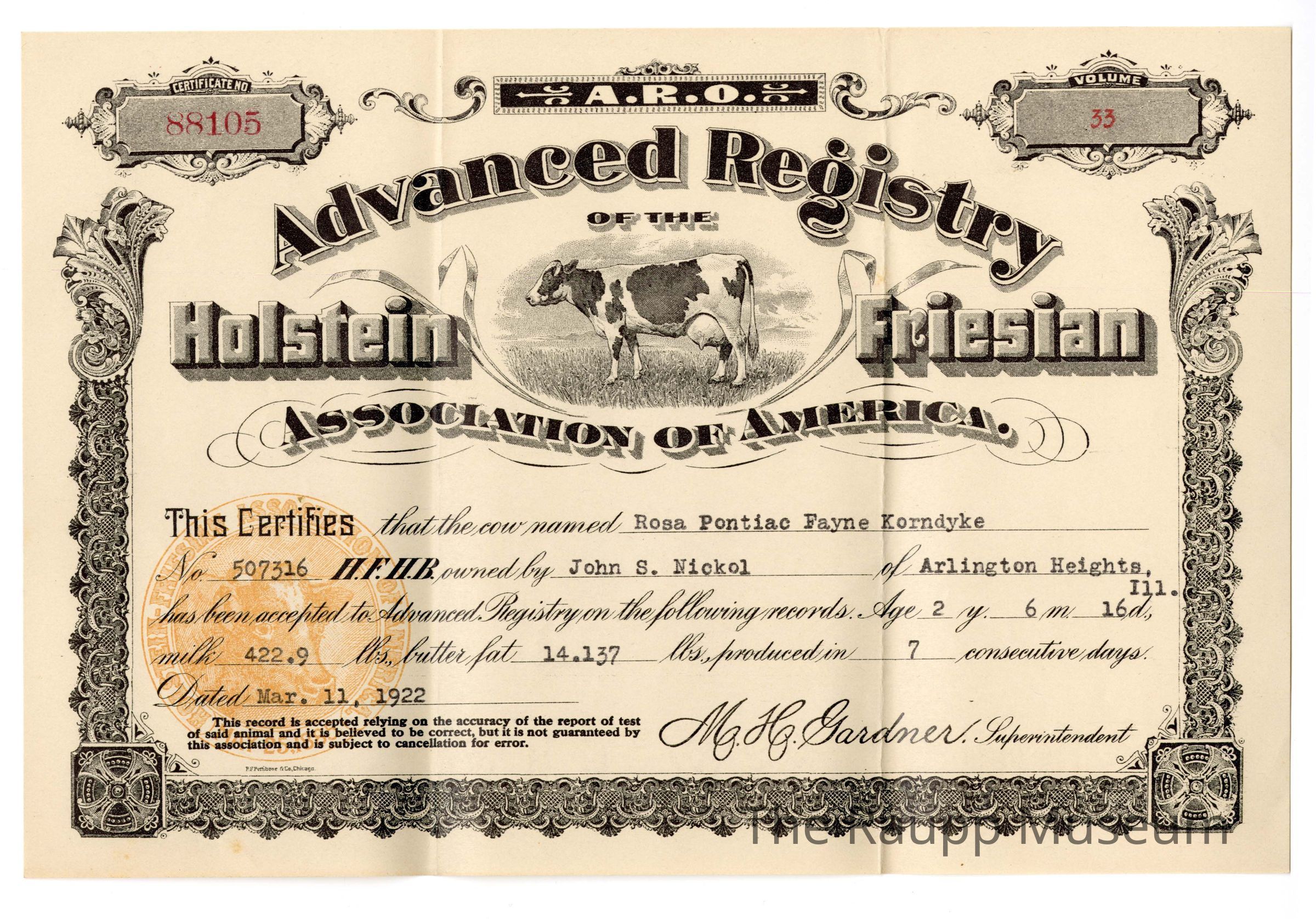 One (1) brown rectangular certificate for Advanced Registry of the Holstein Friesian Association of American. Certificate has decorative black border with a picture of a cow in the center. Certificate certifies that "Rosa Pontiac Fayne Korndyke" (owned by John S. Nickol) has been accepted into the advanced registry, for the amount of milk and butter fat produced in 7 consecutive days. Certificate is dated March 11, 1922.