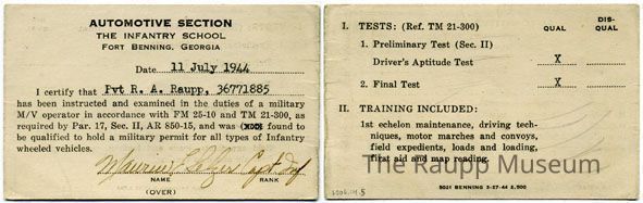Off-white, wallet sized card. Certificate of completion for the Automotive Section of the Infantry School. Card text: "Automotive Section; The Infantry School United States Army; Fort Benning, Georgia; date 11 July 1944; I certify that Pvt R A Raupp 36771885 has been instructed an examined in the duties of a military M/V operator in accordance with FM 25-10 and TM 21-300, as/required by Par. 17, sec. II AR 850-15, and was found to/be qualified to hold a military permit for all types of Infantry/ wheeled vehicles." Signature in lower right area. reverse side contains information on exams administers, has Xs under QUAL for qualified.Relationships