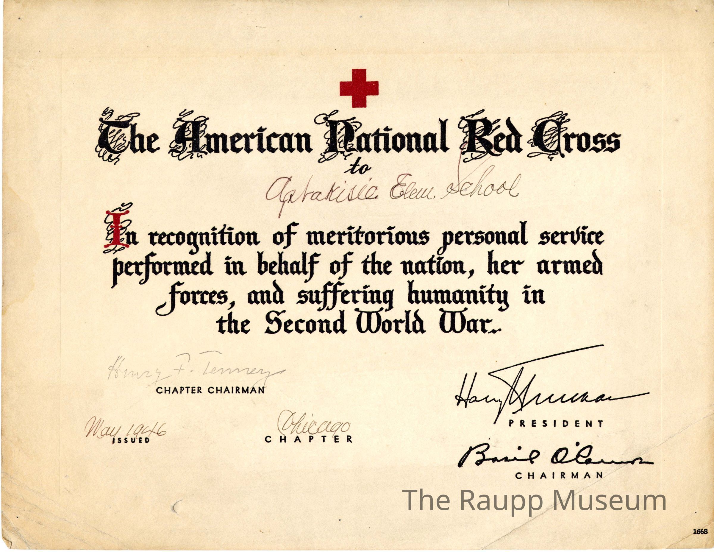 One (1) letter sized certificate for Aptakisic School from May 1946. Certificate has a red cross in the top center and that text printed as follows: "The American National Red Cross to Aptakisic Elem. School, In recognition of meritorious personal service performed in behalf of the nation, her armed forces, and suffering humanity in the Second World War." It is signed by the Red Cross Chapter Chairman (Henry F. Tenney), issued May 1946, Chicago Chapter. It is also signed by President and Chairman.Archive Details