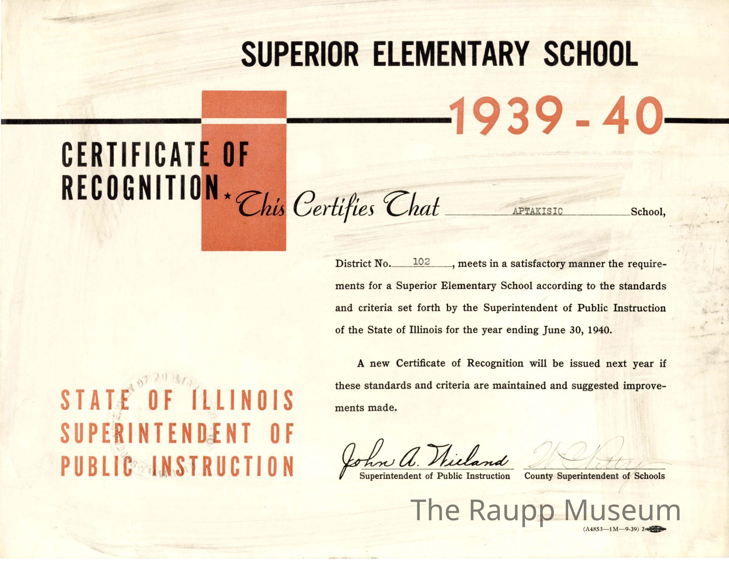 One (1) letter-sized certificate for Aptakisic School for recognition of criteria and standards in teaching, 1939-1940. Certificate has mainly printed text, with some typed portions in center. Certificate reads as follows: "Superior Elementary School 1939-1940, Certificate of Recognition, The certifies that Aptakisic School, District No. 102, meets in a satisfactory manner the requirements for the Superior Elementary School according to the standards and criteria set forth by the Superintendent of Public Instruction of the State of Illinois for the year ending June 30, 1940. A new Certificate of Recognition will be issued next year if these standards and criteria are maintained and suggested improvements made; State of Illinois Superintendent of Public Instruction". It is signed by John A Wieland (Superintendent of Public Instruction) and W. C. Petty (County Superintendent of Schools). Some text is black, with some titles in orange. There is a black line near the top and an orange rectangle near center left. There is an embossed stamp in bottom left.Archive Details