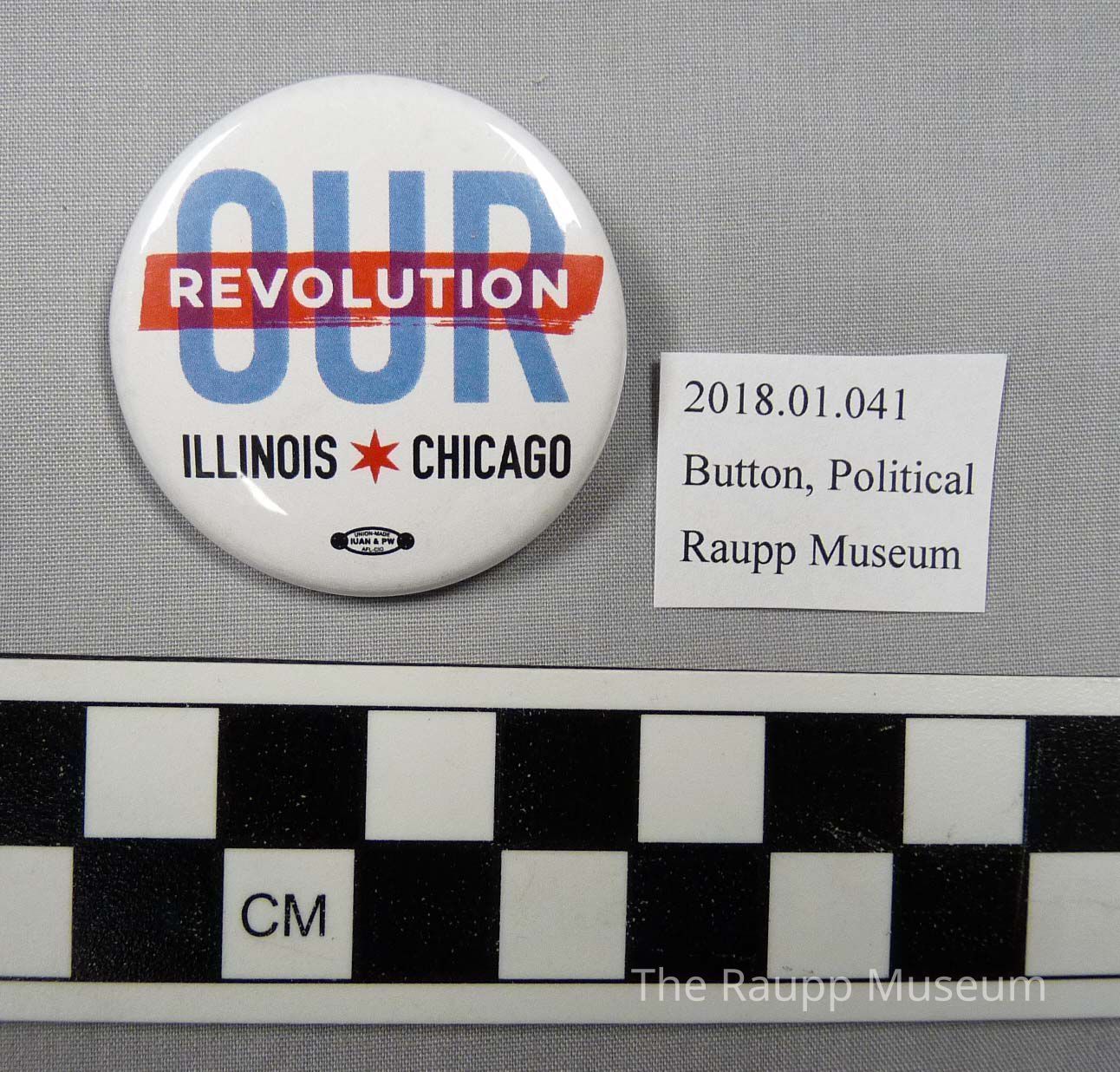 One (1) political button. The button has the text "our revolution Illinois Chicago" on one side, and silver metal on the back side. There is a picture of a red star on the front. The button is white, blue, red, and black. There is a safety pin affixed to the back.Condition