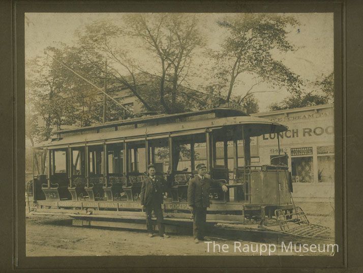 Black and white print mounted to brown card. Image of the exterior of a streetcar with two conductors standing in front. Text on the side of the streetcar: "Chicago Consolidated Company; Elston Ave route." Donor contact information label on the reverse side of mat.Dimensions