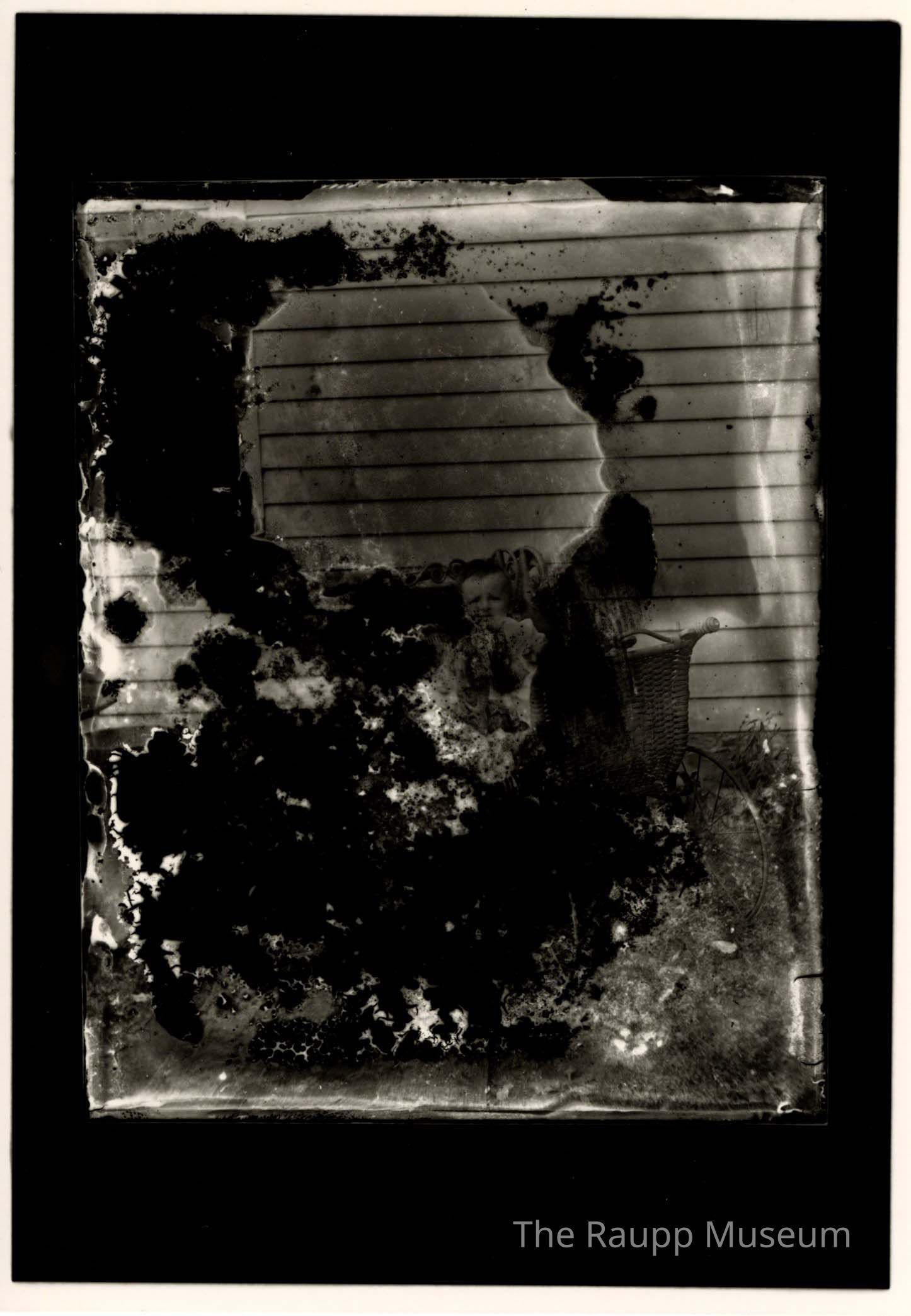One (1) black and white photo taken from a glass negative. Photo shows young child in a buggy outside a house, although photo is heavily damaged and not clear.