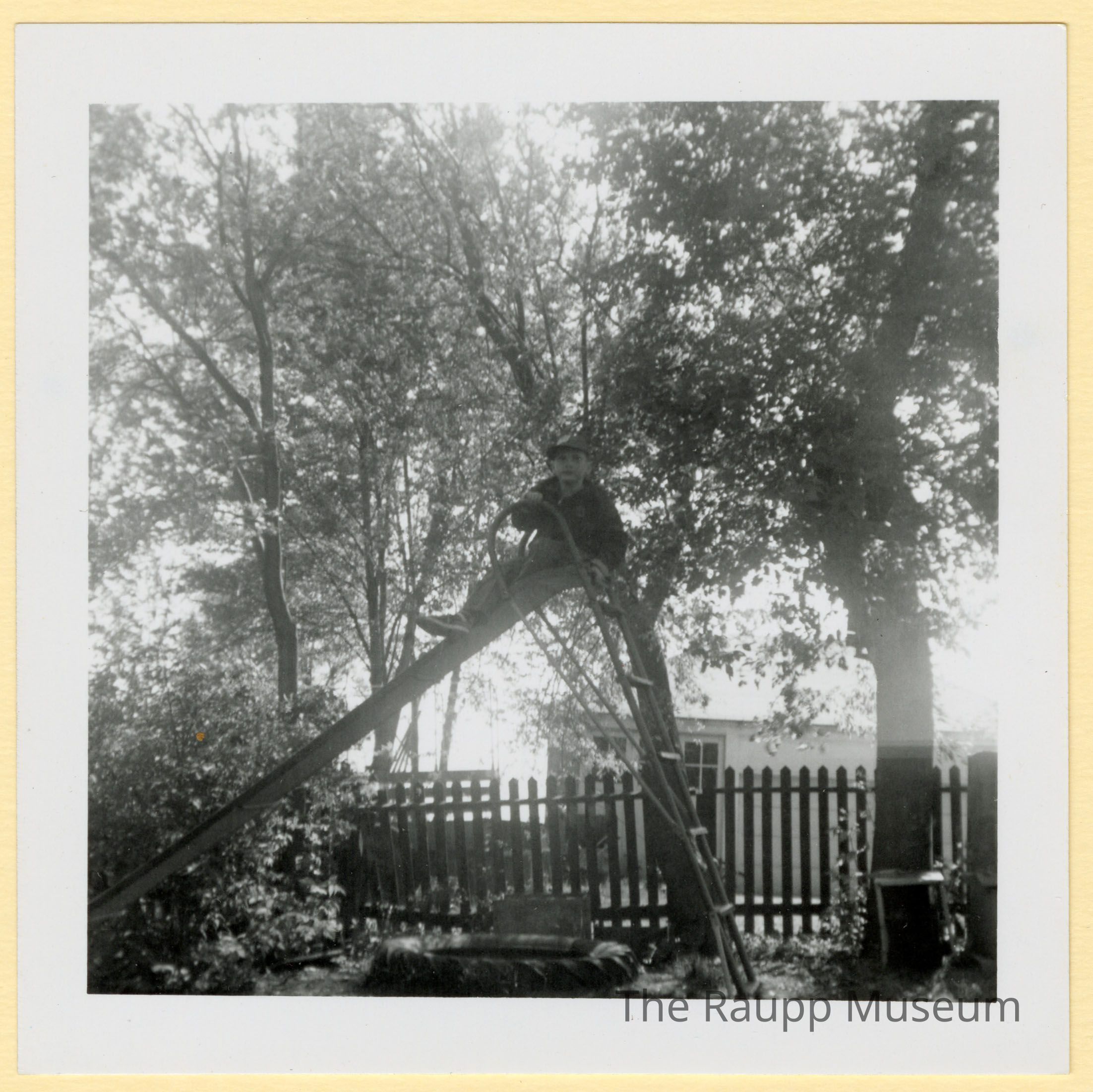 One (1) black and white photograph of a young boy on the top of a metal slide. Behind him are trees, and a wooden fence, with a white house behind that. There is a tire under the slide. Donor believes this was taken at Buffalo Grove home.