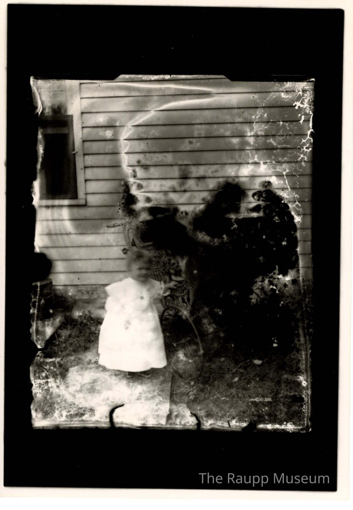 One (1) black and white photo taken from a glass negative. Photo shows young child (1-2 years) in a white dress with their left hand holding a woven buggy or stroller. They are standing in front of a house with a window on the left.