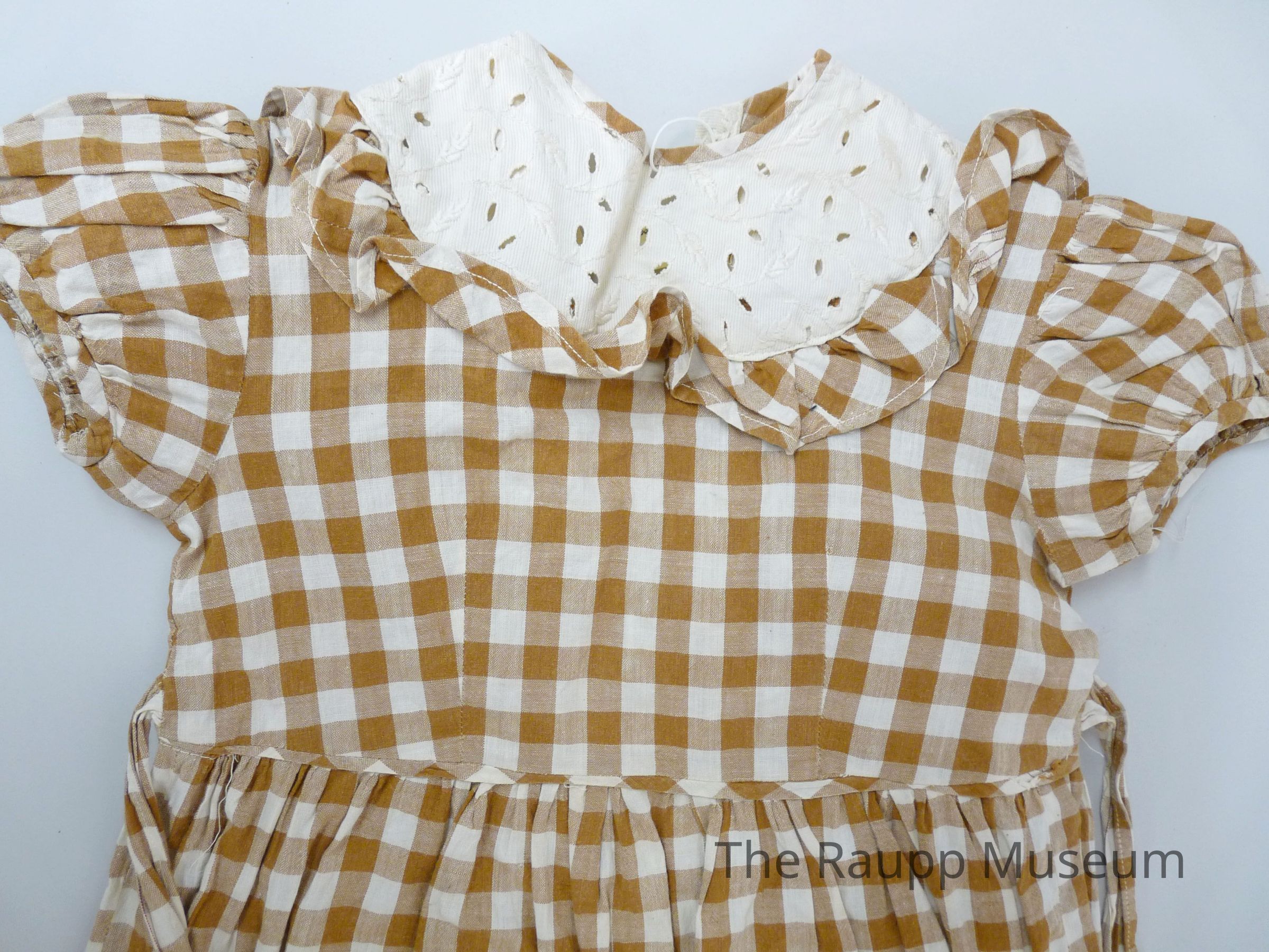 One (1) white and brown child's dress. 2 color 1/4" checked fabric, eyelet lace woke inset with ruffle, very slightly poufed sleeves, ties at gathered waist 3 back button holes, one fragment of a natural shell button.