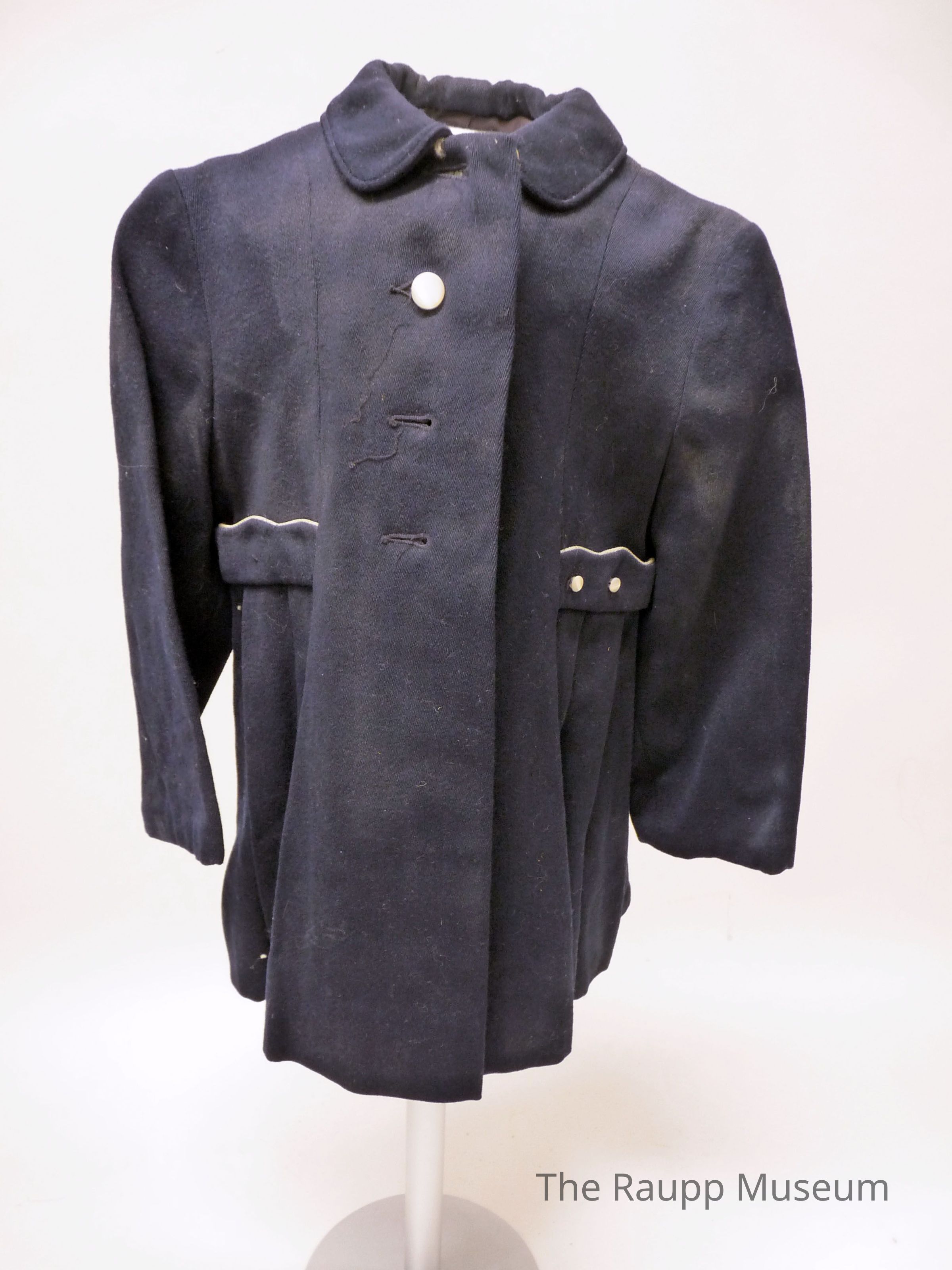 One (1) blue child's dress (matching outfit with coat and hat). Dress is blue wool with four white plastic buttons on the front, and two white smaller round buttons on the left side on a decorative belt (right side are missing). The decorative belt is also blue wool but has a zigzag top pattern with white border on top. There is a blue collar and silk purple interior. The belt continues on the back, with three white round buttons on back.Material