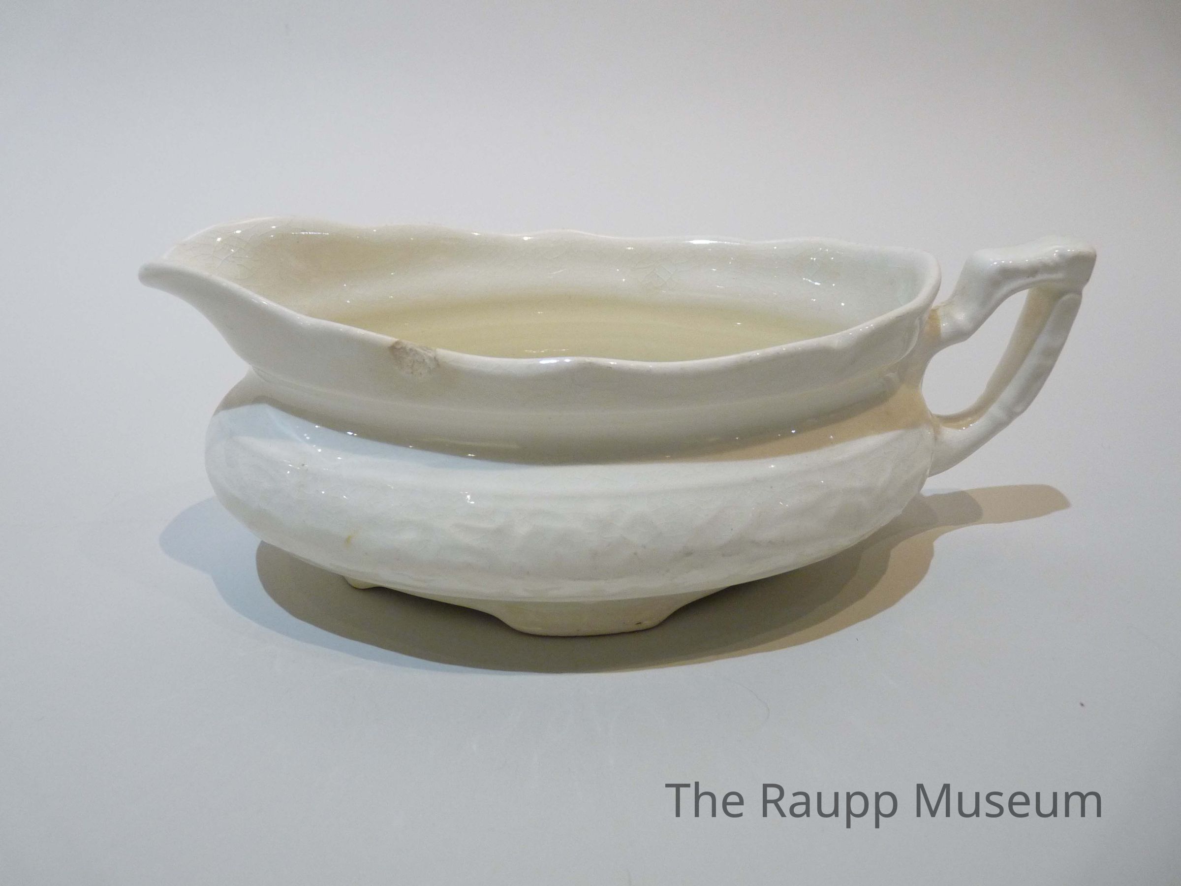 One (1) white china sauceboat. Oblong shape with pointed handle scalloped top edge and base, 1" border in center with embossed design of foilage, flowers, and birds.