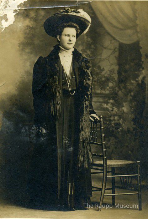 One (1) black and white sepia toned photograph of Christina Kunigunda Brehm [Nickol]. Christina is standing with her left hand resting on the back of a chair. She is wearing a black dress and black long coat. She has on a full scarf, and white undershirt with a chain around her neck and attached at the waist. She has on a black large brimmed hat with white feathers. To her left is a wood chair, and behind her is a painted background of flowers, trees, pillars, and a curtain.Dimensions