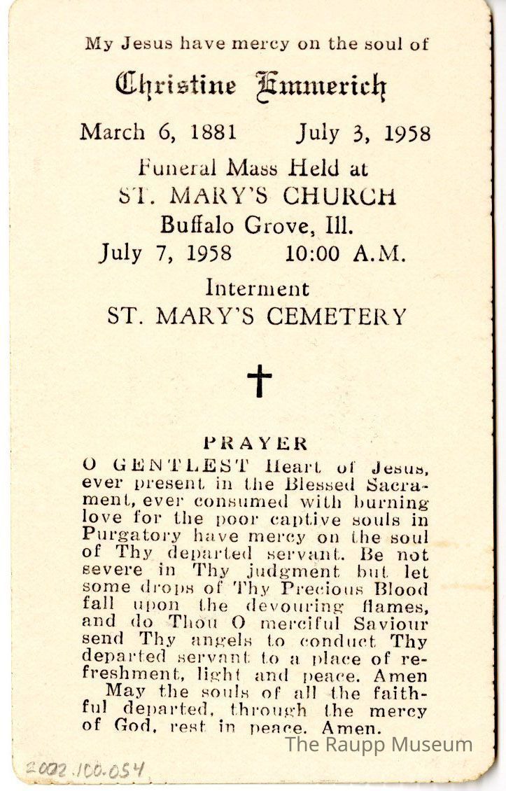 One (1) double-sided funerary card for Christine Emmerich. The front has a picture of a woman standing with a pink dress and blue and white cape. She has a white cloth wrap on her head and a halo around her head. She is standing on a red ball with a snake at her feat. The background is yellow. The back has printed information for funeral of Christine Emmerich and a prayer.Archive Details