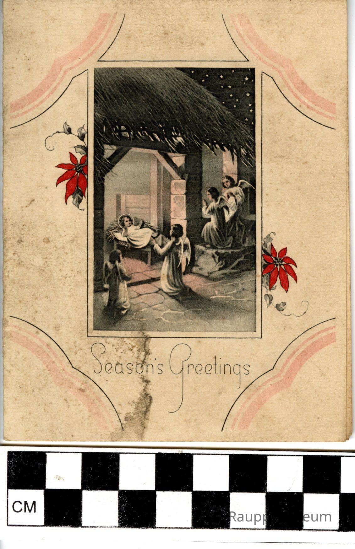 One (1) square Christmas card from 1937. The card has a color photo of the baby Jesus in the manger, with 4 angels around him outside praying. There are two red flowers around the photo with a pink and black decorative frame in the corners. On the bottom is printed "Season's Greetings". Inside the card is printed: "May the Holy Infant bless you this Christmastide and abide with you in the New Year". Handwritten in ink below is: "To Petie Fraucie and Sebie; From Georgie, Reuie and Keuuie" Dec 25 - 1937". The names are not printed clearly and are guessed.
