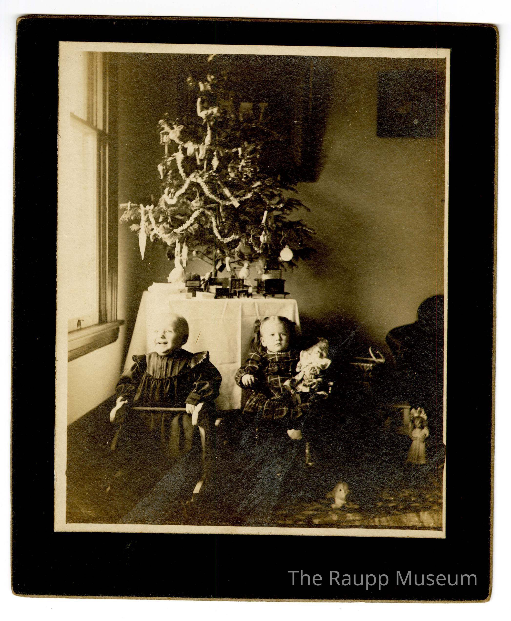 One (1) cabinet card photograph of two children in front of a Christmas tree on a table. Image is sepia toned, with a young child on the left and a young girl, older, on the right. The baby is wearing a black dress and seated in a supportive wooden rocking horse toy, looking off to their right. The girl has a dark checkered dress and is holding a doll on her left, leaning back in a small chair. On the left side is a window and on the right is a chair. Behind the children is a table with white tablecloth over it, and a Christmas tree decorated with small presents underneath. There are two other dolls visible on the ground on the right.Dimensions