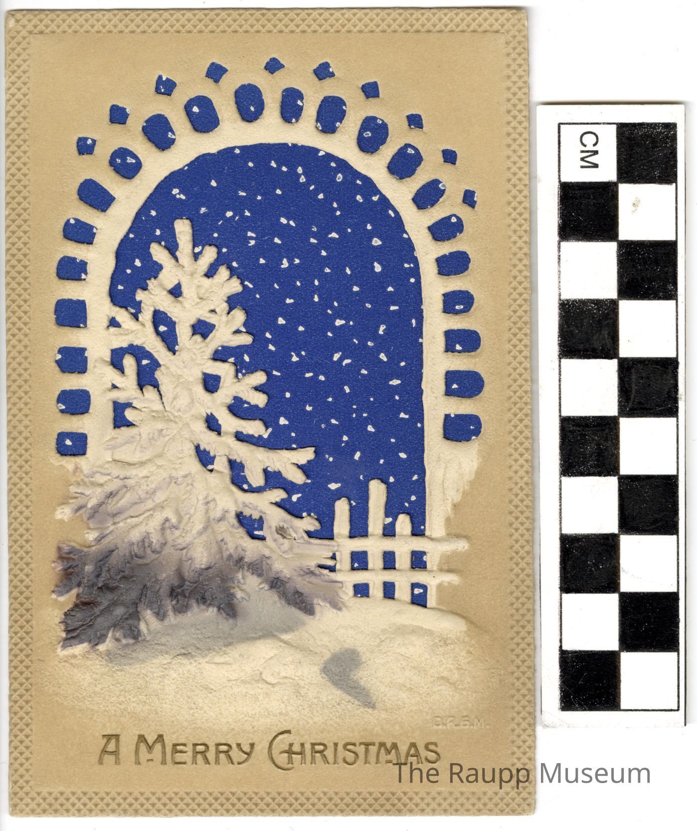 One (1) beige, blue and white Christmas postcard. On the front there is an embossed white and grey tree and snow in front of a fence with a window design. Behind the tree is blue with white "snowflakes" design. On the bottom is embossed in gold "A Merry Christmas".