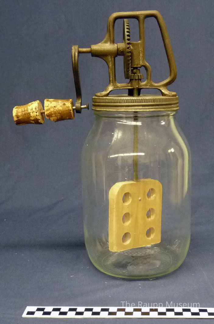 Large, cylindrical glass jar with perforated wooden paddle attachment. With metal screw cap and crank with cork handle. Used for churning cream.Dimensions
