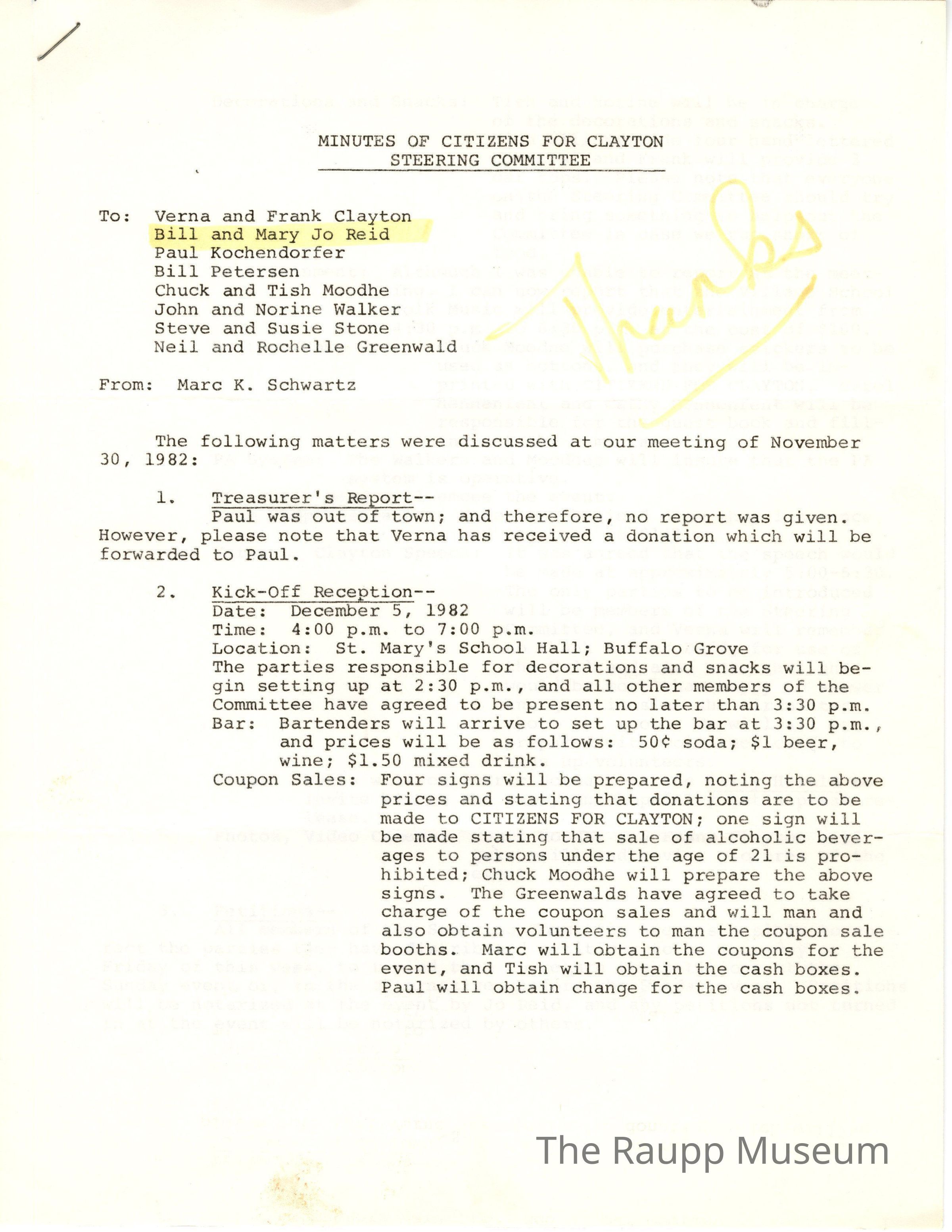 One (1) 3 page, single sided, typed notes for the minutes of the citizens for clayton steering committee on Nov. 30, 1982. Contains some yellow highlighted portions. Staple in top left corner.
