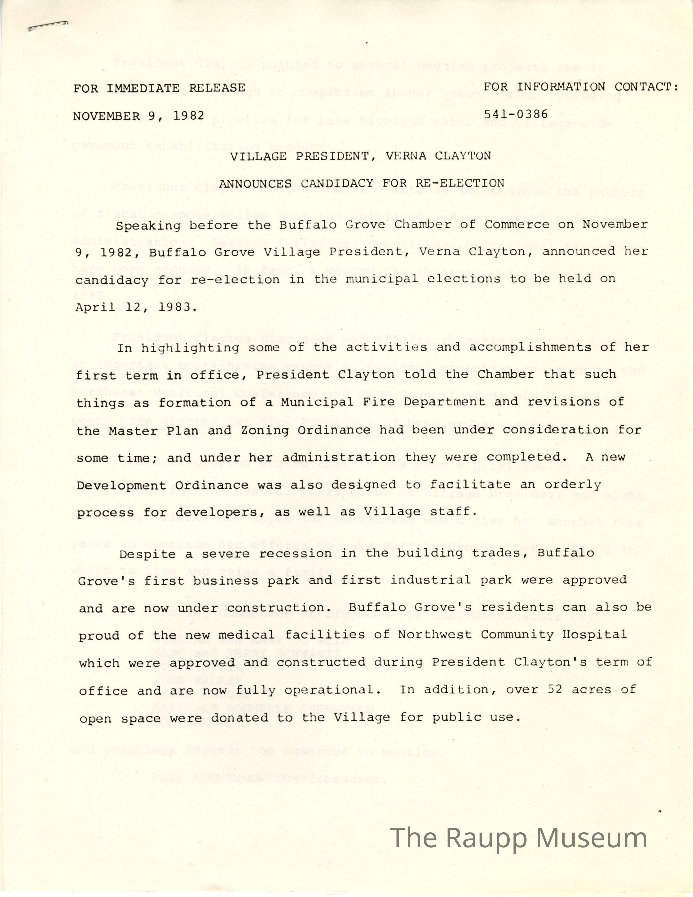 One (1) typed two page news release for Verna Clayton "Announces Candidacy for Re-Election", released Nov. 9, 1982. Has a staple in top left corner.