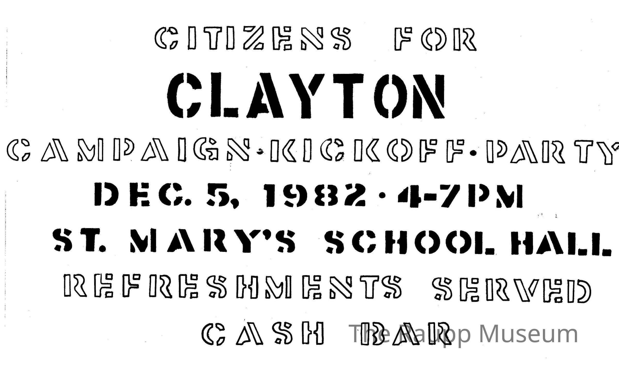 One (1) black and white stencil block letter poster for Citizens for Clayton Campaign Kick-Off Party on Dec. 5, 1982. Is long rectangular poster.