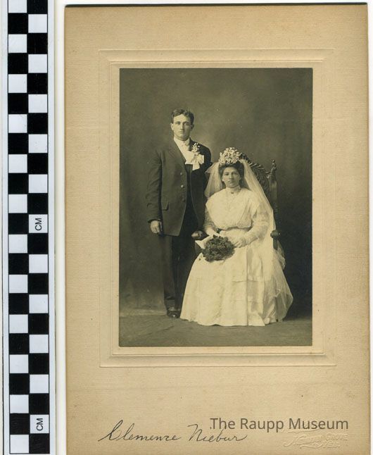 Black and white print mounted to a tan card with faux frame border. Wedding portrait image of Clemence (Clemens) Niebur and Clara Diedrich. He is standing on the left side wearing a suit and boutonniere with a large white bow. She is seated wearing a white wedding dress with wide ruffled, lace yoke, puffed sleeves and tiered hem. Her hair is pulled into a soft bun with a pile of flowers on her head as a headpiece with long veil. Ink inscription on front of mat "Clemence Niebur."Dimensions