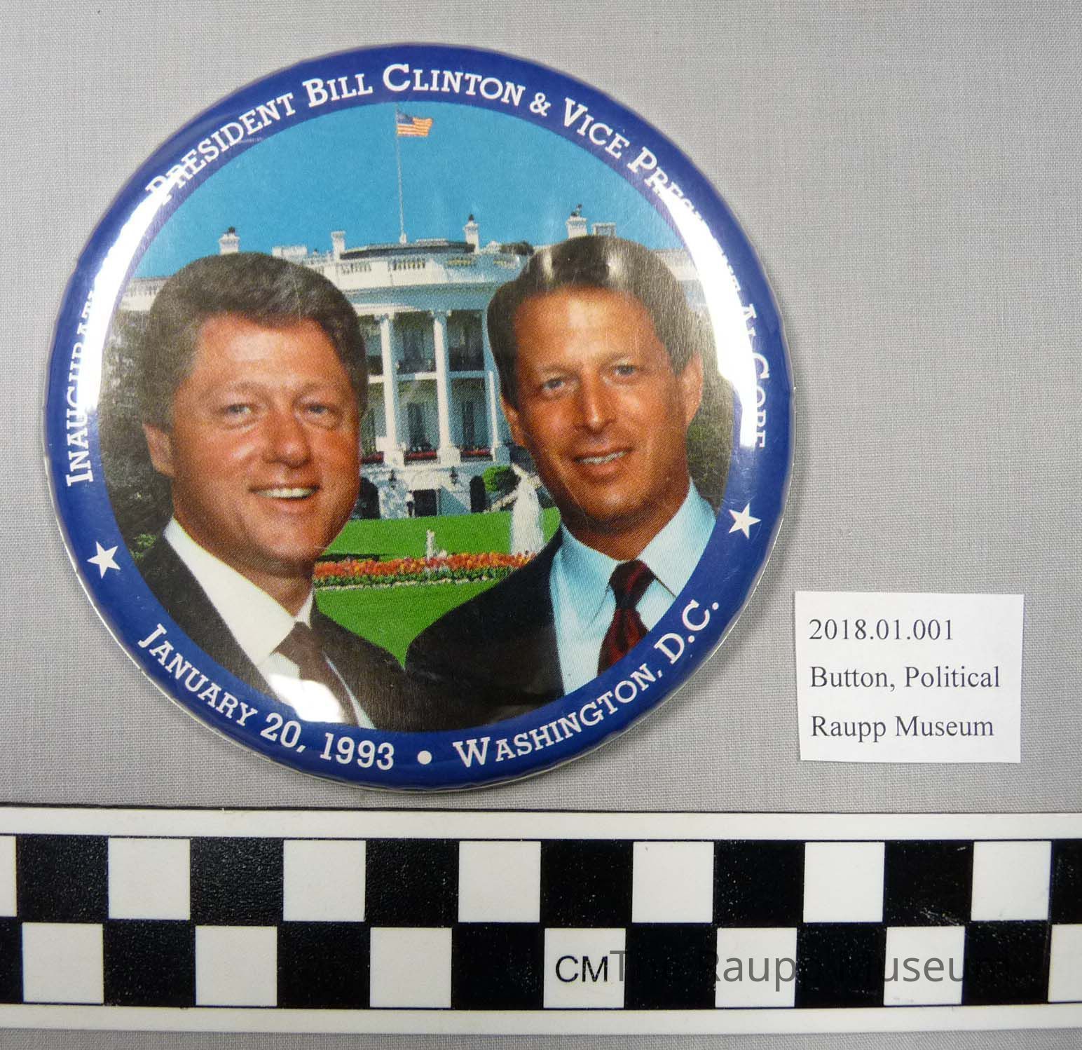 One (1) multipartisan political button for the inauguration of President Bill Clinton and Vice President Al Gore. The button has a photo of Bill Clinto and Al Gore with the White House and lawn in the background and has the text: "Inauguration of President Bill Clinton & Vice President Al Gore. January 20, 1993, Washington, D.C.". The button is made of metal, with a metal horiztonal clasp and plastic covering on front.Condition