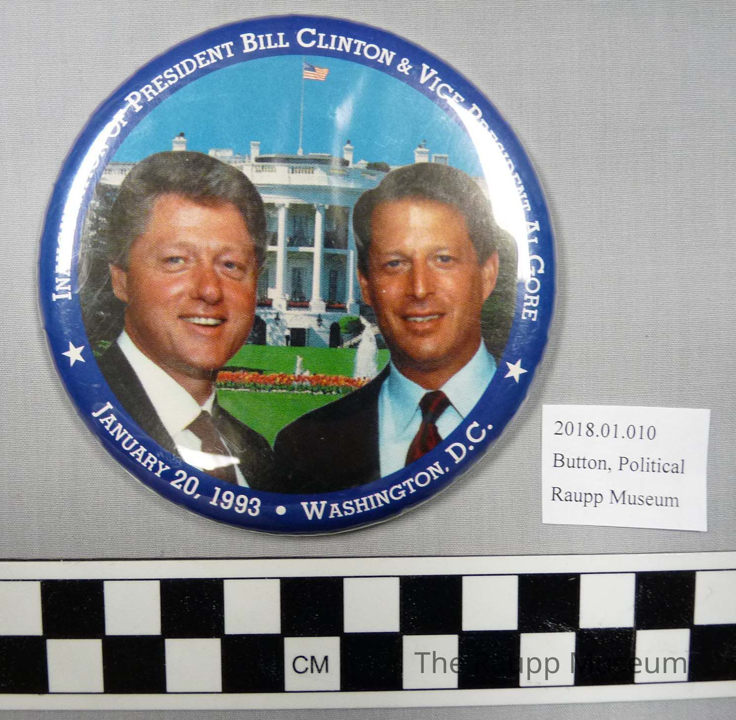 One (1) political button. The pin has the text "Inauguration of President Bill Clinton and Vice President Al Gore January 20, 1993 Washington DC" on one side, and silver, with some black scratches, on the back side. There is a picture of Clinton and Gore with the White House behind them. The button is white, blue, red, and black. There is a safety pin affixed to the back.Condition