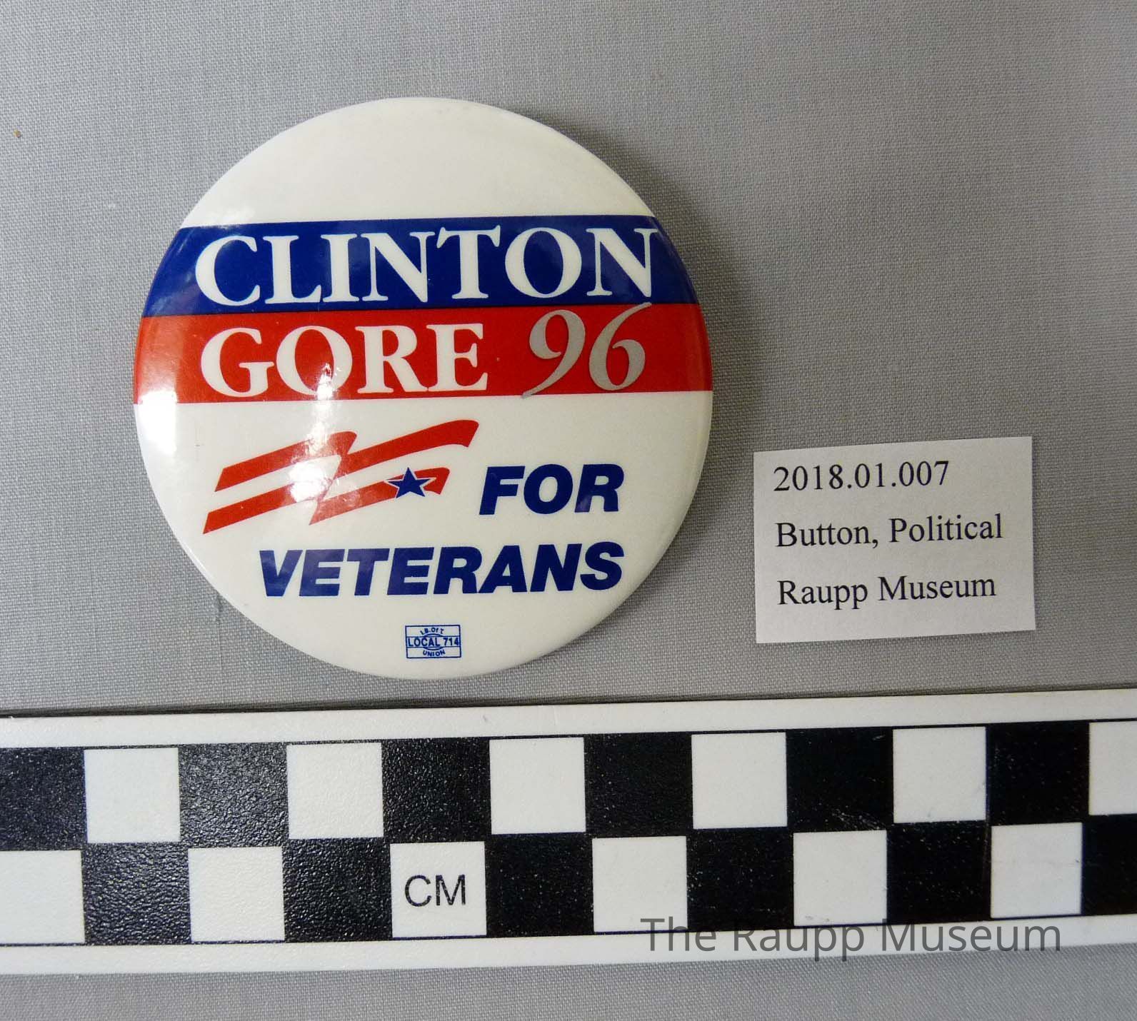 One (1) political button. The pin has the text "Clinton Gore 96 for Veterans Local 714" on one side, and silver on the back side. There is an "11" written in ink on the back. There is a safety pin affixed to the back.Condition