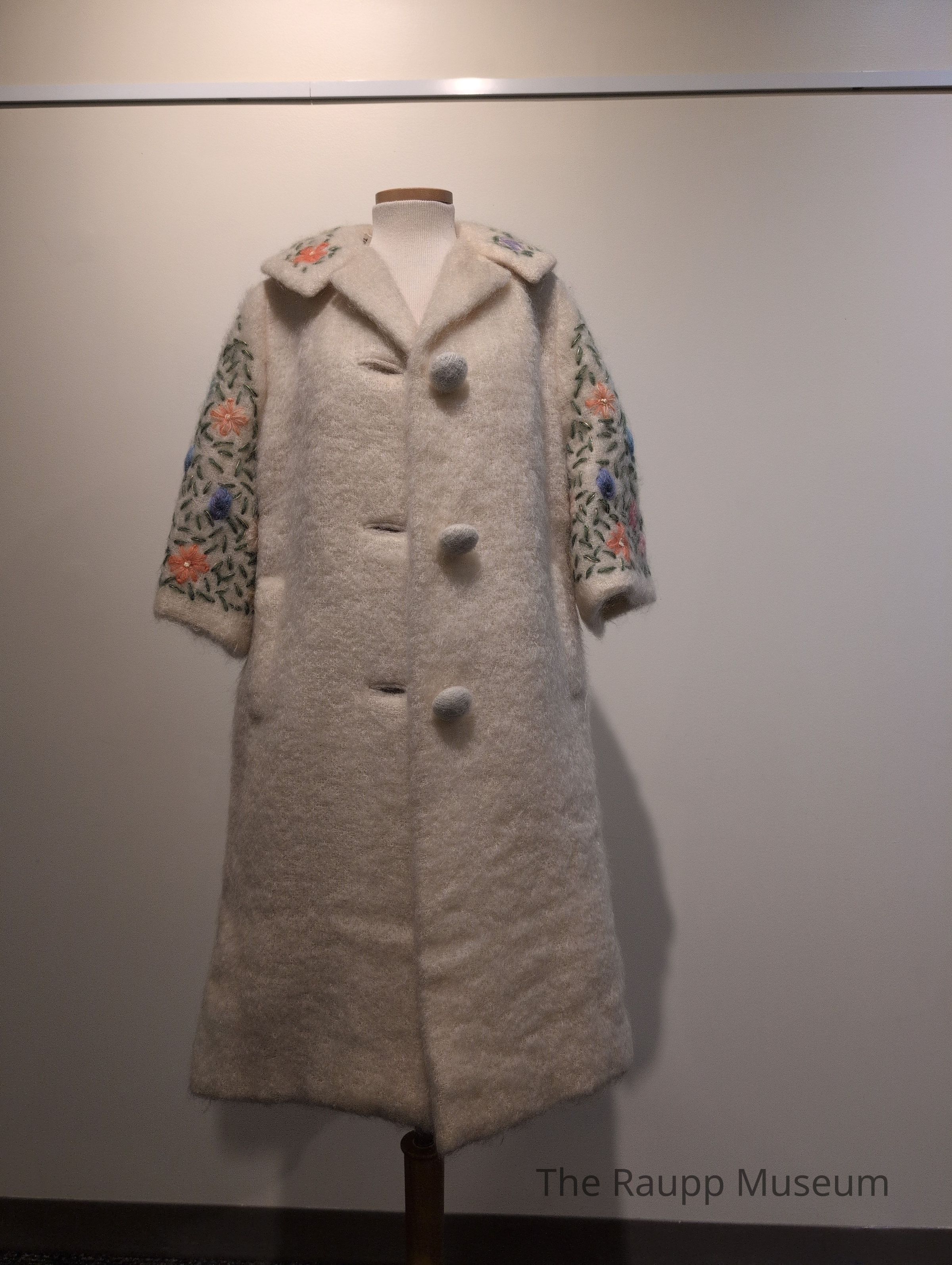 Off-white woman's overcoat with colorful embroidered floral 3/4 length sleeves and collar.