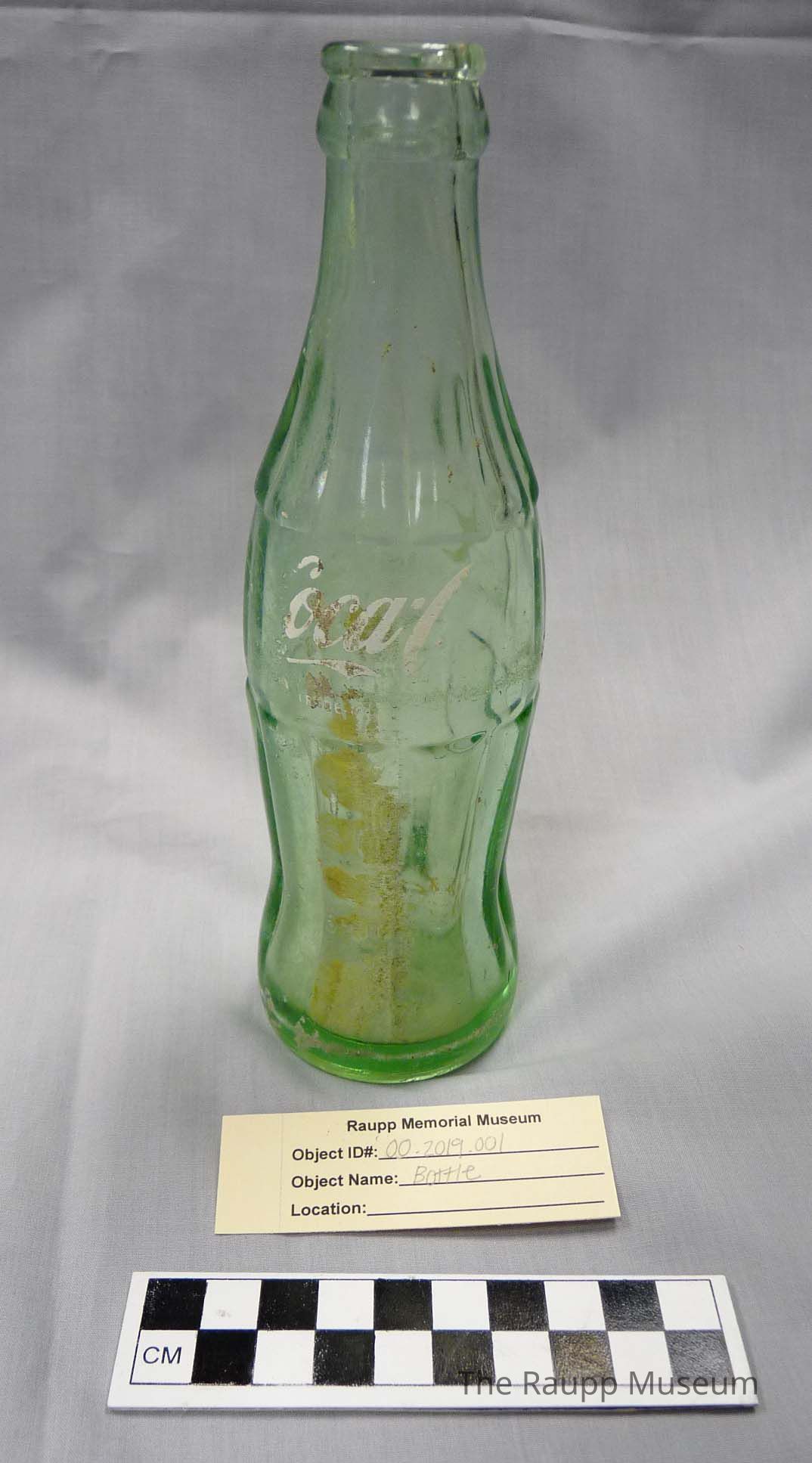 One (1) light translucent green Coca Cola glass bottle. Along the center of the bottle is printed in white lettering "Coca C..." and "C". The rest of the lettering has worn off. There is no cork in the bottle. The bottle is the 1950s style glass bottles for Coca Cola, with rounded bottle, ribbed edges and a flat round surface in the center for the logo. Bottle is estimated 8 ounces.Dimensions
