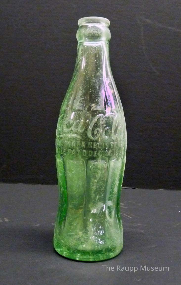 One (1) green glass coke bottle (6oz.). Reads trademark registered bottle patented Dec. 25, 1923. Bottom of bottle reads "KEOKUKTOWA" in raised glass. Marks on bottle include: "Coca-cola trademark regsitered min. contents 6-Fl. Ozs" on front. "Trademark registered bottle Pat'd Dec. 25, 1923".