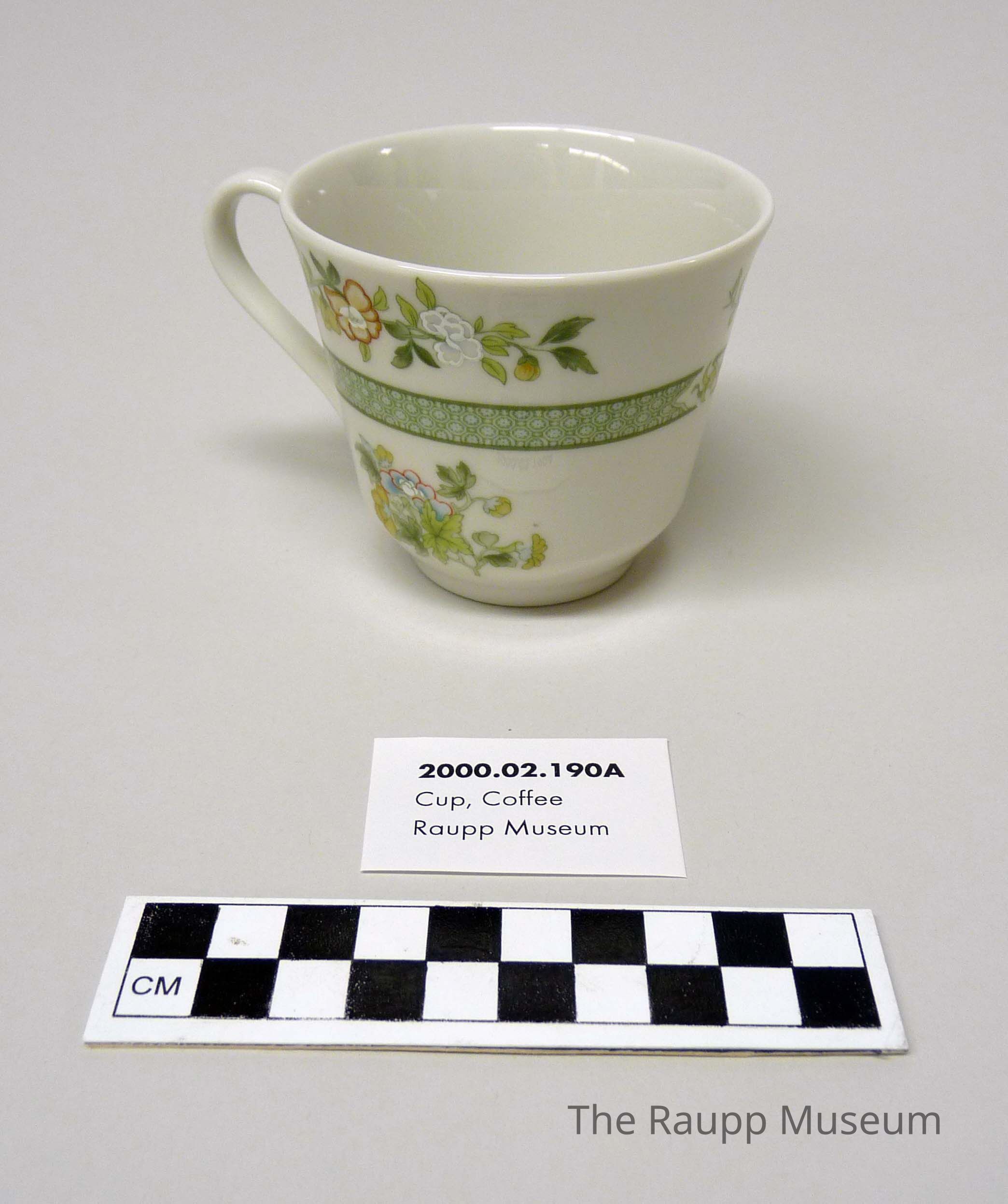 One (1) white, green, and yellow china coffee cup. Cup has a green circular pattern design in the center and flowers at the top and bottom of the cup with red, yellow, and blue coloring. Marks: "Made in England Royal-Doulton England, Fine China, Tonkin T.C. 1107, Doulton & Co. Limited 1974". Small handle on one side.Dimensions