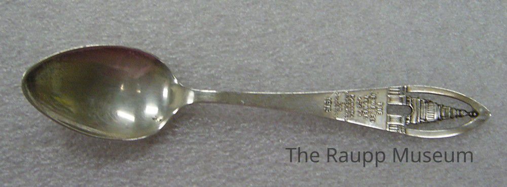 One (1) sterling silver teaspoon, with cutout of the Jeweled Tower on the end of the handle. Inscription below cutout of tower.Condition