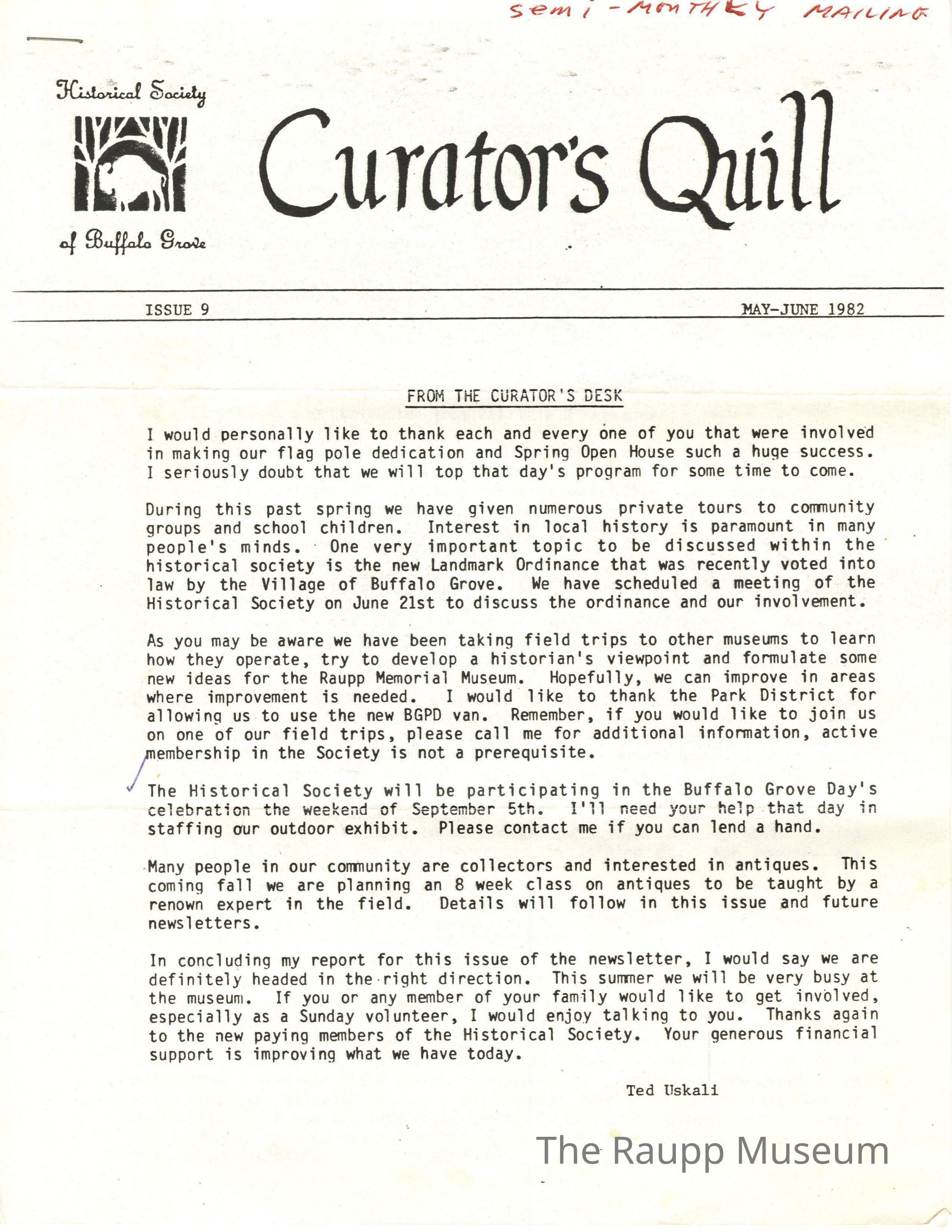 Three (3) documents grouped as papers from the Buffalo Grove Historical Society. The first page is a pamphlet about the Raupp Museum, with hours, a Buffalo logo, and a description of the museum. The second page is a list of items to discuss with visiting societies, titled "The Making of a Successful Museum". The third item (5 pages) is a copy of the Curator's Quill, Issue 9, May-June 1982- it is a Raupp Museum newsletter and has updates, information for members, and upcoming events.Archive Items Details